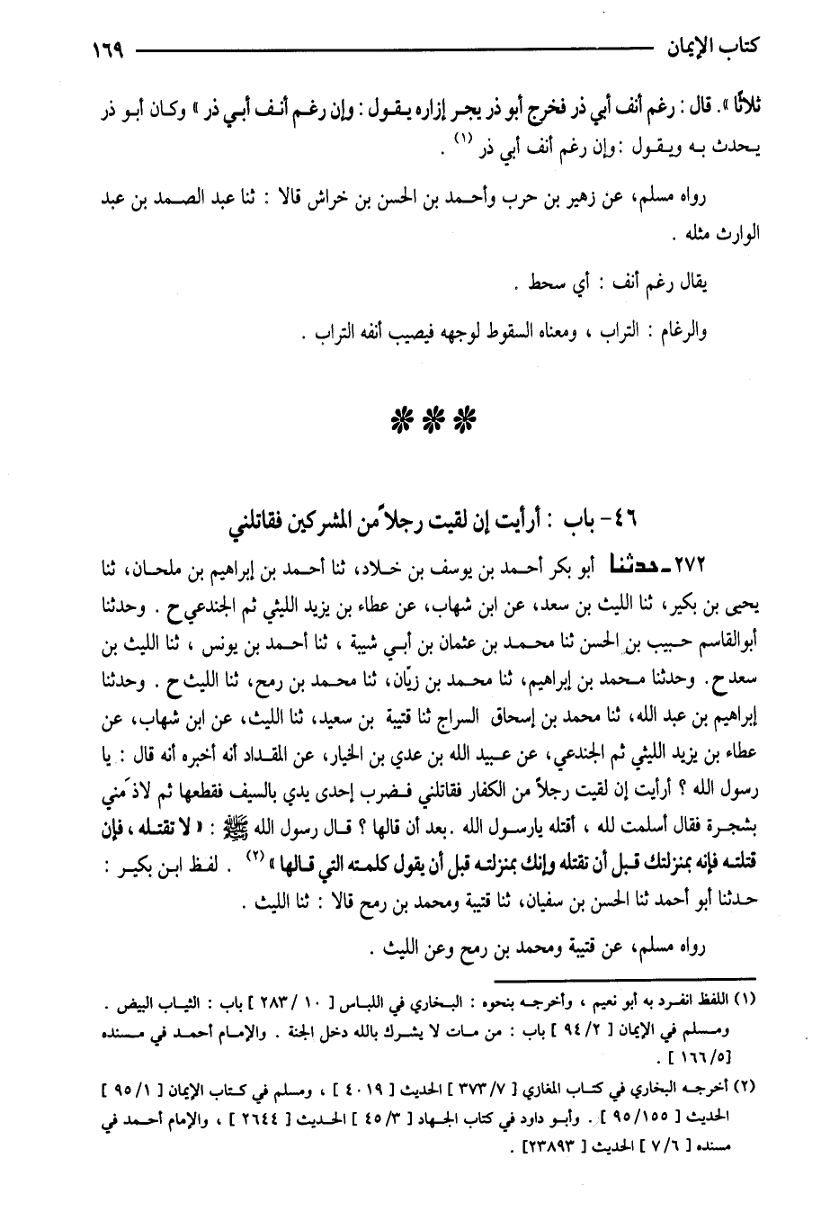 272 - حَدَّثَنَا أَبُو بَكْرٍ أَحْمَدُ بْنُ يُوسُفَ بْنِ خَلادٍ ثَنَا أَحْمَدُ بْنُ إِبْرَاهِيمَ بْنِ مِلْحَانَ ثَنَا يَحْيَى بْنُ بُكَيْرٍ ثَنَا اللَّيْثُ بْنُ سَعْدٍ عَنِ ابْنِ شِهَابٍ عَنْ عَطَاءِ بْنِ يَزِيدَ اللَّيْثِيِّ ثُمَّ الْجُنْدَعِيِّ ح وَحَدَّثَنَا أَبُو الْقَاسِمِ حَبِيبٌ بْنِ الْحَسَنِ ثَنَا مُحَمَّدُ بْنُ عُثْمَانَ بْنِ أَبِي شَيْبَةَ ثَنَا أَحْمَدُ بْنُ يُونُسَ ثَنَا اللَّيْثُ بْنُ سَعْدٍ ح وَحَدَّثَنَا مُحَمَّدُ بْنُ إِبْرَاهِيمَ ثَنَا مُحَمَّدُ بْنُ زَيَّانَ ثَنَا مُحَمَّدُ بْنُ رُمْحٍ ثَنَا اللَّيْثُ ح وَحَدَّثَنَا إِبْرَاهِيمُ بْنُ عَبْدِ اللَّهِ ثَنَا مُحَمَّدُ بْنُ إِسْحَاقَ السَّرَّاجُ ثَنَا قُتَيْبَةُ بْنُ سَعِيدٍ ثَنَا اللَّيْثُ عَنْ ابْنِ شِهَابٍ عَنْ عَطَاءِ بْنِ يَزِيدَ اللَّيْثِيِّ ثُمَّ الْجُنْدَعِيِّ عَنْ عُبَيْدِ اللَّهِ بْنِ عَدِيِّ بْنِ الْخِيَارِ عَنِ الْمِقْدَادِ أَنَّهُ أَخْبَرَهُ أَنَّهُ قَالَ يَا رَسُولَ اللَّهِ أَرَأَيْتَ إِنْ لَقِيتُ رَجُلا مِنَ الْكُفَّارِ فَقَاتَلَنِي فَضَرَبَ إِحْدَى يَدَيْ بِالسَّيْفِ فَقَطَعَهَا ثُمَّ لاذَ مِنِّي بِشَجَرَةٍ فَقَالَ أَسْلَمْتُ لِلَّهِ أَقْتُلُهُ يَا رَسُولَ اللَّهِ بَعْدَ أَنْ قَالَهَا قَالَ رَسُولُ اللَّهِ صَلَّى اللَّهُ عَلَيْهِ وَسَلَّمَ (لَا تَقْتُلْهُ فَإِنْ قَتَلْتَهُ فَإِنَّهُ بِمَنْزِلَتِكَ قَبْلَ أَنْ تَقْتُلَهُ وَإِنَّكَ بِمَنْزِلَتِهِ قَبْلَ أَنْ يَقُولَ كَلِمَتَهُ الَّتِي قَالَهَا) لَفْظُ ابْنِ بُكَيْرٍ حَدَّثَنَا أَبُو أَحْمَدَ ثَنَا الْحَسَنُ بْنُ سُفْيَانَ ثَنَا قُتَيْبَةُ وَمُحَمَّدُ بْنُ رُمْحٍ قَالا ثَنَا اللَّيْثُ