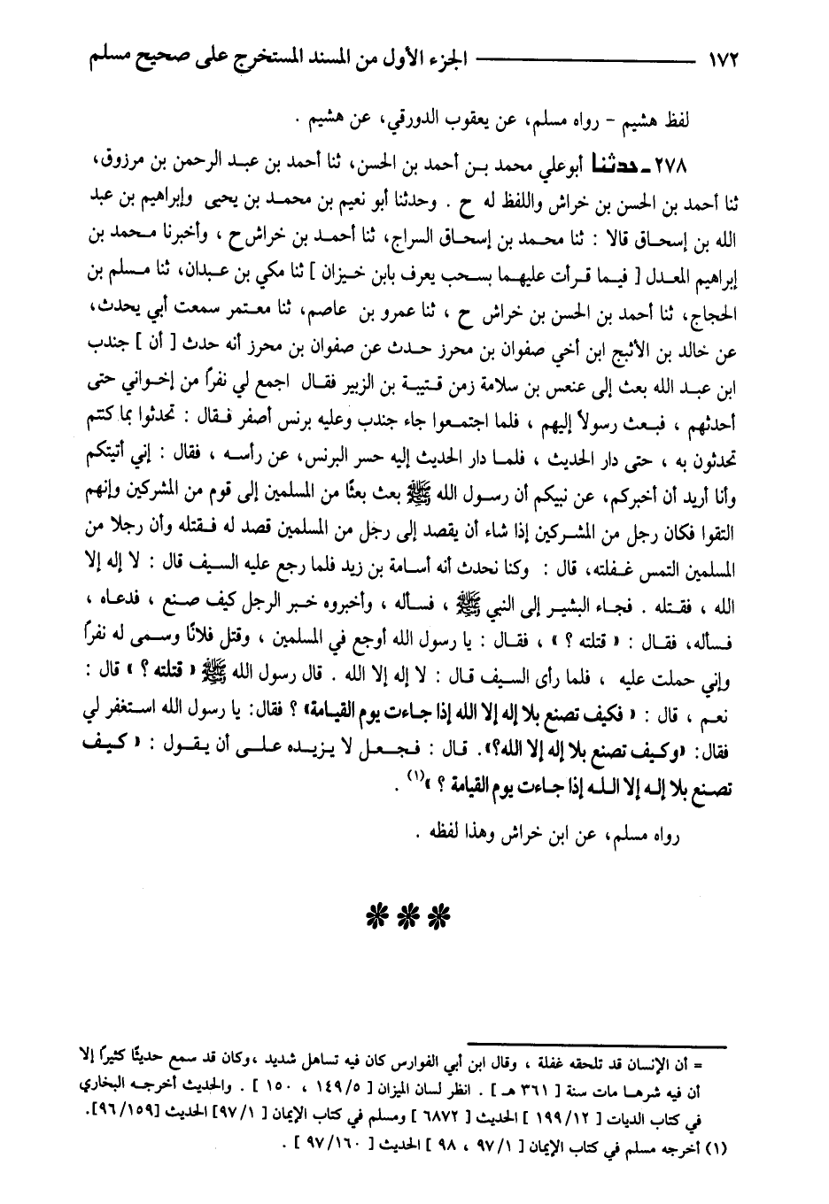 278 - حَدَّثَنَا أَبُو عَلِيٍّ مُحَمَّدُ بْنُ أَحْمَدَ بْنُ الْحَسَنِ ثَنَا أَحْمَدُ بْنُ عَبْدِ الرَّحْمَنِ بْنِ مَرْزُوقٍ ثَنَا أَحْمَدُ بْنُ الْحَسَنِ بْنِ خِرَاشٍ وَاللَّفْظُ لَهُ ح وَحَدَّثَنَا أَبُو نُعَيْمِ بْنُ مُحَمَّدِ بْنِ يَحْيَى وَإِبْرَاهِيمُ بْنُ عَبْدِ اللَّهِ بْنِ إِسْحَاقَ قَالا ثَنَا مُحَمَّدُ بْنُ إِسْحَاقَ السَّرَّاجُ ثَنَا أَحْمَدُ بْنُ خِرَاشٍ ح وَأَخْبَرَنَا مُحَمَّدُ بْنُ إِبْرَاهِيمَ الْمُعَدَّلُ فِيمَا قَرَأْتُ عَلَيْهِمَا بِسَحْبٍ يُعْرَفُ بِابْنِ خَيْزَانَ ثَنَا مَكِّيُّ بْنُ عَبْدَانَ ثَنَا مُسْلِمُ بْنُ الْحَجَّاجِ ثَنَا أَحْمَدُ بْنُ الْحسن بن خرَاش ح ثَنَا عَمْرُو بْنُ عَاصِمٍ ثَنَا مُعْتَمِرٌ سَمِعْتُ أَبِي يُحَدِّثُ عَنْ خَالِدِ بْنِ الأَثْبَجِ ابْنِ أَخِي صَفْوَانَ بْنِ مُحْرِزٍ حَدَّثَ عَنْ صَفْوَانَ بْنِ مُحْرِزٍ أَنَّهُ حَدَّثَ أَن جُنْدُب ابْن عبد الله بعث إِلَى عنعس بْنِ سَلامَةَ زَمَنَ قُتَيْبَةَ بْنِ الزُّبَيْرِ فَقَالَ اجْمَعْ لِي نَفَرًا مِنْ إِخْوَانِي حَتَّى أُحَدِّثَهُمْ فَبَعَثَ رَسُولا إِلَيْهِمْ فَلَمَّا اجْتَمَعُوا جَاءَ جُنْدُبٌ وَعَلَيْهِ بُرْنُسٌ أَصْفَرُ فَقَالَ تَحَدَّثُوا بِمَا كُنْتُمْ تُحَدِّثُونَ بِهِ حَتَّى دَارَ الْحَدِيثُ فَلَمَّا دَارَ الْحَدِيثُ إِلَيْهِ حَسَرَ الْبُرْنُسَ عَنْ رَأْسِهِ فَقَالَ إِنِّي أَتَيْتُكُمْ وَأَنَا أُرِيدُ أَنْ أُخْبِرَكُمْ عَنْ نَبِيِّكُمْ إِنَّ رَسُولَ اللَّهِ صَلَّى اللَّهُ عَلَيْهِ وَسَلَّمَ بَعَثَ بَعْثًا مِنَ الْمُسْلِمِينَ إِلَى قَوْمٍ مِنَ الْمُشْرِكِينَ وَإِنَّهُمُ الْتَقَوْا فَكَانَ رَجُلٌ مِنَ الْمُشْرِكِينَ إِذَا شَاءَ أَنْ يَقْصِدَ إِلَى رَجُلٍ مِنَ الْمُسْلِمِينَ قَصَدَ لَهُ فَقَتَلَهُ وَأَنَّ رَجُلا مِنَ الْمُسْلِمِينَ الْتَمَسَ غَفْلَتَهُ قَالَ وَكُنَّا نُحَدِّثُ أَنَّهُ أُسَامَةُ بْنُ زَيْدٍ فَلَمَّا رَجَعَ عَلَيْهِ السَّيْفُ قَالَ لَا إِلَهَ إِلا اللَّهُ فَقَتَلَهُ فَجَاءَ الْبَشِيرُ إِلَى النَّبِيِّ صَلَّى اللَّهُ عَلَيْهِ وَسَلَّمَ فَسَأَلَهُ وَأَخْبَرُوهُ خَبَّرَ الرَّجُلَ كَيْفَ صَنَعَ فَدَعَاهُ فَسَأَلَهُ فَقَالَ (قَتَلْتُهُ) فَقَالَ يَا رَسُولَ اللَّهِ أَوْجَعَ فِي الْمُسْلِمِينَ وَقَتَلَ فُلانًا وَسَمَّى لَهُ نَفَرًا وَإِنِّي حَمَلْتُ عَلَيْهِ فَلَمَّا رَأَى السَّيْفُ قَالَ لَا إِلَهَ إِلا اللَّهُ قَالَ رَسُولُ اللَّهِ صَلَّى اللَّهُ عَلَيْهِ وَسَلَّمَ (قَتَلْتَهُ) قَالَ نَعَمْ قَالَ (فَكَيْفَ تَصْنَعُ بِلا إِلَهَ إِلا اللَّهُ إِذَا جَاءَتْ يَوْمَ الْقِيَامَةِ) فَقَالَ يَا رَسُولَ اللَّهِ اسْتَغْفِرْ لِي فَقَالَ (وَكَيْفَ تَصْنَعُ بِلا إِلَهَ إِلا اللَّهُ) قَالَ فَجعل لايزيده عَلَى أَنْ يَقُولَ (كَيْفَ تَصْنَعُ بِلا إِلَهَ إِلا اللَّهُ إِذَا جَاءَتْ يَوْمَ الْقِيَامَةِ)