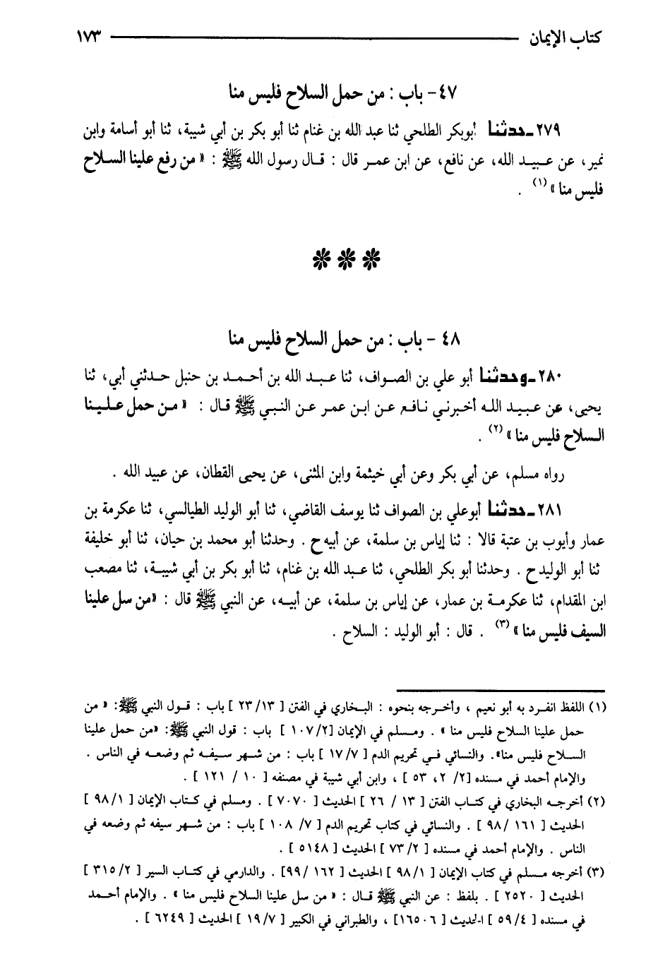 280 - وَحَدَّثَنَا أَبُو عَلِيِّ بْنُ الصَّوَّافِ ثَنَا عَبْدُ اللَّهِ بْنُ أَحْمَدَ بْنِ حَنْبَلٍ حَدَّثَنِي أَبِي ثَنَا يَحْيَى عَنْ عُبَيْدِ اللَّهِ أَخْبَرَنِي نَافِعٌ عَنِ ابْنِ عُمَرَ عَنِ النَّبِيِّ صَلَّى اللَّهُ عَلَيْهِ وَسَلَّمَ قَالَ (مَنْ حَمَلَ عَلَيْنَا السِّلاحَ فَلَيْسَ مِنَّا)