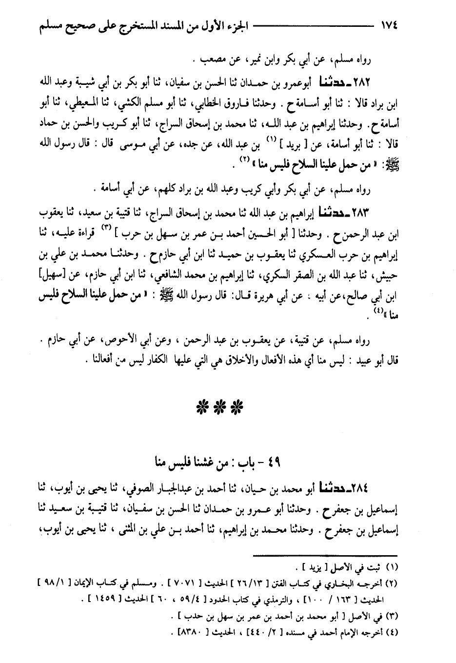 282 - حَدَّثَنَا أَبُو عَمْرِو بْنُ حَمْدَانَ ثَنَا الْحَسَنُ بْنُ سُفْيَانَ ثَنَا أَبُو بَكْرِ بْنُ أَبِي شَيْبَةَ وَعبد الله ابْن بَرَّادٍ قَالا ثَنَا أَبُو أُسَامَةَ ح وَحَدَّثَنَا فَارُوقٌ الْخَطَّابِيُّ ثَنَا أَبُو مُسْلِمٍ الْكَشِّيُّ ثَنَا الْمُعَيْطِيُّ ثَنَا أَبُو أُسَامَةَ ح وَحَدَّثَنَا إِبْرَاهِيمُ بْنُ عَبْدِ اللَّهِ ثَنَا مُحَمَّدُ بْنُ إِسْحَاقَ السَّرَّاجُ ثَنَا أَبُو كُرَيْبٍ وَالْحَسَنُ بْنُ حَمَّادٍ قَالا ثَنَا أَبُو أُسَامَةَ عَنْ بريد بْنِ عَبْدِ اللَّهِ عَنْ جَدِّهِ عَنْ أَبِي مُوسَى قَالَ قَالَ رَسُولُ اللَّهِ صَلَّى اللَّهُ عَلَيْهِ وَسَلَّمَ (مَنْ حَمَلَ عَلَيْنَا السِّلاحَ فَلَيْسَ مِنَّا)