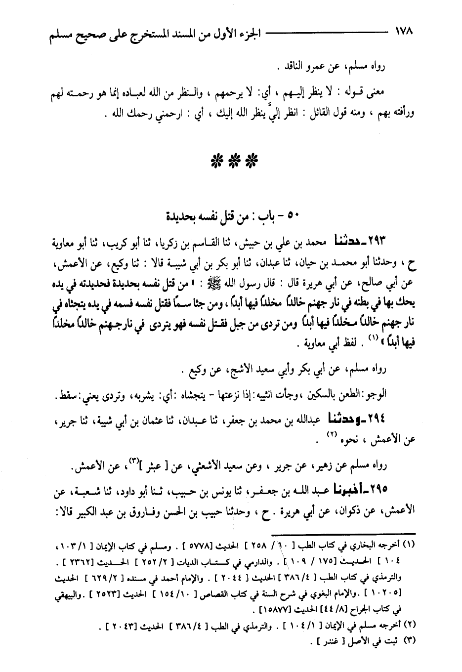 293 - حَدَّثَنَا مُحَمَّدُ بْنُ عَلِيِّ بْنِ حُبَيْشٍ ثَنَا الْقَاسِمُ بْنُ زَكَرِيَّا ثَنَا أَبُو كُرَيْبٍ ثَنَا أَبُو مُعَاوِيَةَ ح وَحَدَّثَنَا أَبُو مُحَمَّدِ بْنُ حَيَّانَ ثَنَا عَبْدَانُ ثَنَا أَبُو بَكْرِ بْنُ أَبِي شَيْبَةَ قَالا ثَنَا وَكِيعٌ عَنِ الأَعْمَشِ عَنْ أَبِي صَالِحٍ عَنْ أَبِي هُرَيْرَةَ قَالَ قَالَ رَسُولُ اللَّهِ صَلَّى اللَّهُ عَلَيْهِ وَسَلَّمَ (مِنْ قَتَلَ نَفْسَهُ بِحَدِيدَةٍ فَحَدِيدَتُهُ فِي يَدِهِ يَحُكُّ بِهَا فِي بَطْنِهِ فِي نَارِ جَهَنَّمَ خَالِدًا مُخَلَّدًا فِيهَا أبدا وَمن جثا سُمًّا فَقَتَلَ نَفْسَهُ فَسُمُّهُ فِي يَده يتجثاه فِي نَار جنهم خَالِدًا مُخَلَّدًا فِيهَا أَبَدًا وَمَنْ تَرَدَّى مِنْ جَبَلٍ فَقَتَلَ نَفْسَهُ فَهُوَ يَتَرَدَّى فِي نَارِ جَهَنَّمَ خَالِدًا مُخَلَّدًا فِيهَا أَبَدًا) لَفْظُ أَبِي مُعَاوِيَةَ
