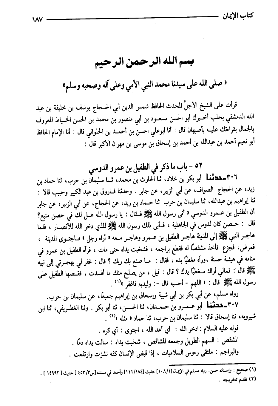 306 - حَدَّثَنَا أَبُو بَكْرِ بْنُ خَلادٍ ثَنَا الْحَارِثُ بْنُ مُحَمَّدٍ ثَنَا سُلَيْمَانُ بْنُ حَرْبٍ ثَنَا حَمَّادُ بْنُ زَيْدٍ عَنِ الْحَجَّاجِ الصَّوَّافِ عَنْ أَبِي الزُّبَيْرِ عَنْ جَابِرٍ وَحَدَّثَنَا فَارُوقُ بْنُ عَبْدِ الْكَبِيرِ وَحَبِيبٌ قَالا ثَنَا إِبْرَاهِيمُ بْنُ عَبْدِ اللَّهِ ثَنَا سُلَيْمَانُ بْنُ حَرْبٍ ثَنَا حمدا بْنُ زَيْدٍ عَنِ الْحَجَّاجِ عَنْ أَبِي الزُّبَيْرِ عَنْ جَابِرٍ أَنَّ الطُّفَيْلَ بْنَ عَمْرٍو الدَّوْسِيَّ (أَتَى رَسُولُ اللَّهِ صَلَّى اللَّهُ عَلَيْهِ وَسَلَّمَ فَقَالَ يَا رَسُولَ اللَّهِ هَلْ لَكَ فِي حِصْنٍ مَنِيعٍ قَالَ حِصْنٌ كَانَ لِدَوْسٍ فِي الْجَاهِلِيَّةِ فَأَبَى ذَلِكَ رَسُولُ اللَّهِ صَلَّى اللَّهُ عَلَيْهِ وَسَلَّمَ لِلَّذِي دَخَرَ اللَّهُ لِلأَنْصَارِ فَلَمَّا هَاجَرَ النَّبِيِّ صَلَّى اللَّهُ عَلَيْهِ وَسَلَّمَ إِلَى الْمَدِينَةِ هَاجَرَ الطُّفَيْلُ بْنُ عَمْرو وَهَاجَر مَعَه أرَاهُ رَجُلٌ فَاجْتَوَى الْمَدِينَةَ فَمَرِضَ فَجَزِعَ فَأَخَذَ مِشْقَصًا لَهُ فَقَطَعَ بَرَاجِمَهُ فَشَخَبَتْ يَدَاهُ حَتَّى مَاتَ فَرَآهُ الطُّفَيْلُ بْنُ عَمْرٍو فِي مَنَامِهِ فِي هَيْئَةٍ حَسَنَةٍ وَرَآهُ مُغَطِّيًا يَدَهُ فَقَالَ مَا صَنَعَ بِكَ رَبُّكَ قَالَ غَفَرَ لِي بِهِجْرَتِي إِلَى نَبِيِّهِ صَلَّى اللَّهُ عَلَيْهِ وَسَلَّمَ قَالَ فَمَالِي أَرَاكَ مُغَطِّيًا يدك قَالَ قيل من يصلح مِنْكَ مَا أَفْسَدْتَ فَقَصَّهَا الطُّفَيْلُ عَلَى رَسُولِ اللَّهِ صَلَّى اللَّهُ عَلَيْهِ وَسَلَّمَ قَالَ (اللَّهُمَّ أَحْسِبُهُ قَالَ وليديه فَاغْفِر) صَحِيح وَإِسْنَادُهُ حَسَنٌ
