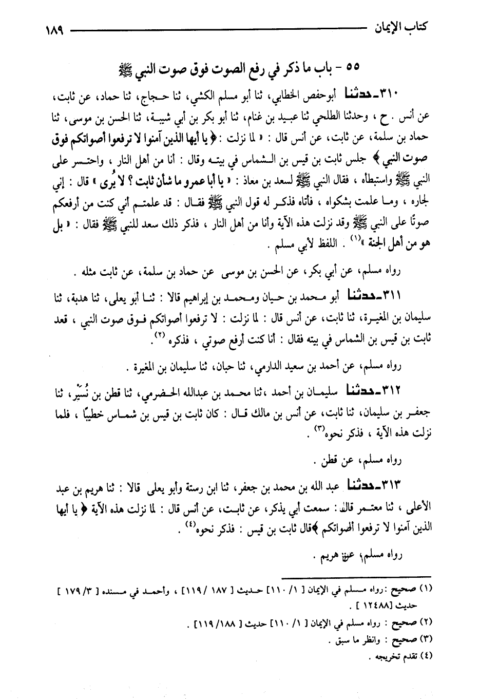 310 - حَدَّثَنَا أَبُو حَفْصٍ الْخَطَّابِيُّ ثَنَا أَبُو مُسْلِمٍ الْكَشِّيُّ ثَنَا حَجَّاجُ ثَنَا حَمَّادٌ عَنْ ثَابِثٍ عَنْ أَنَسٍ ح وَحَدَّثَنَا الطَّلْحِيُّ ثَنَا عُبَيْدُ بْنُ غَنَّامٍ ثَنَا أَبُو بَكْرِ بْنُ أَبِي شَيْبَةَ ثَنَا الْحَسَنُ بْنُ مُوسَى ثَنَا حَمَّادُ بْنُ سَلَمَةَ عَنْ ثَابِثٍ عَنْ أنس قَالَ لما نزلت {يَا أَيهَا الَّذِينَ آمَنُوا لَا تَرْفَعُوا أَصْوَاتَكُمْ فَوق صَوت النَّبِي} جلس ثابث بْنُ قَيْسِ بْنِ الشَّمَّاسِ فِي بَيْتِهِ وَقَالَ أَنَا مِنْ أَهْلِ النَّارِ وَاحْتَسَرَ عَلَى النَّبِيِّ صَلَّى اللَّهُ عَلَيْهِ وَسَلَّمَ وَاسْتَبْطَأَهُ فَقَالَ النَّبِيِّ صَلَّى اللَّهُ عَلَيْهِ وَسَلَّمَ لِسَعْدِ بْنِ مُعَاذٍ (يَا أَبَا عَمْرٍو مَا شَأْنُ ثَابِتٍ لَا يُرَى قَالَ إِنِّي لَجَارُهُ وَمَا عَلِمْتُ بِشَكْوَاهُ فَأَتَاهُ فَذَكَرَ لَهُ قَوْلِ النَّبِيِّ صَلَّى اللَّهُ عَلَيْهِ وَسَلَّمَ فَقَالَ قَدْ عَلِمْتُمْ أَنِّي كُنْتُ مِنْ أَرْفَعِكُمْ صَوْتًا عَلَى النَّبِيِّ صَلَّى اللَّهُ عَلَيْهِ وَسَلَّمَ وَقَدْ نَزَلَتْ هَذِهِ الآيَةُ وَأَنَا مِنْ أَهْلِ النَّارِ فَذَكَرَ ذَلِكَ سَعْدٌ لِلنَّبِيِّ صَلَّى اللَّهُ عَلَيْهِ وَسَلَّمَ فَقَالَ (بَلْ هُوَ مِنْ أهل الْجنَّة) صَحِيح اللَّفْظُ لأَبِي مُسْلِمٍ