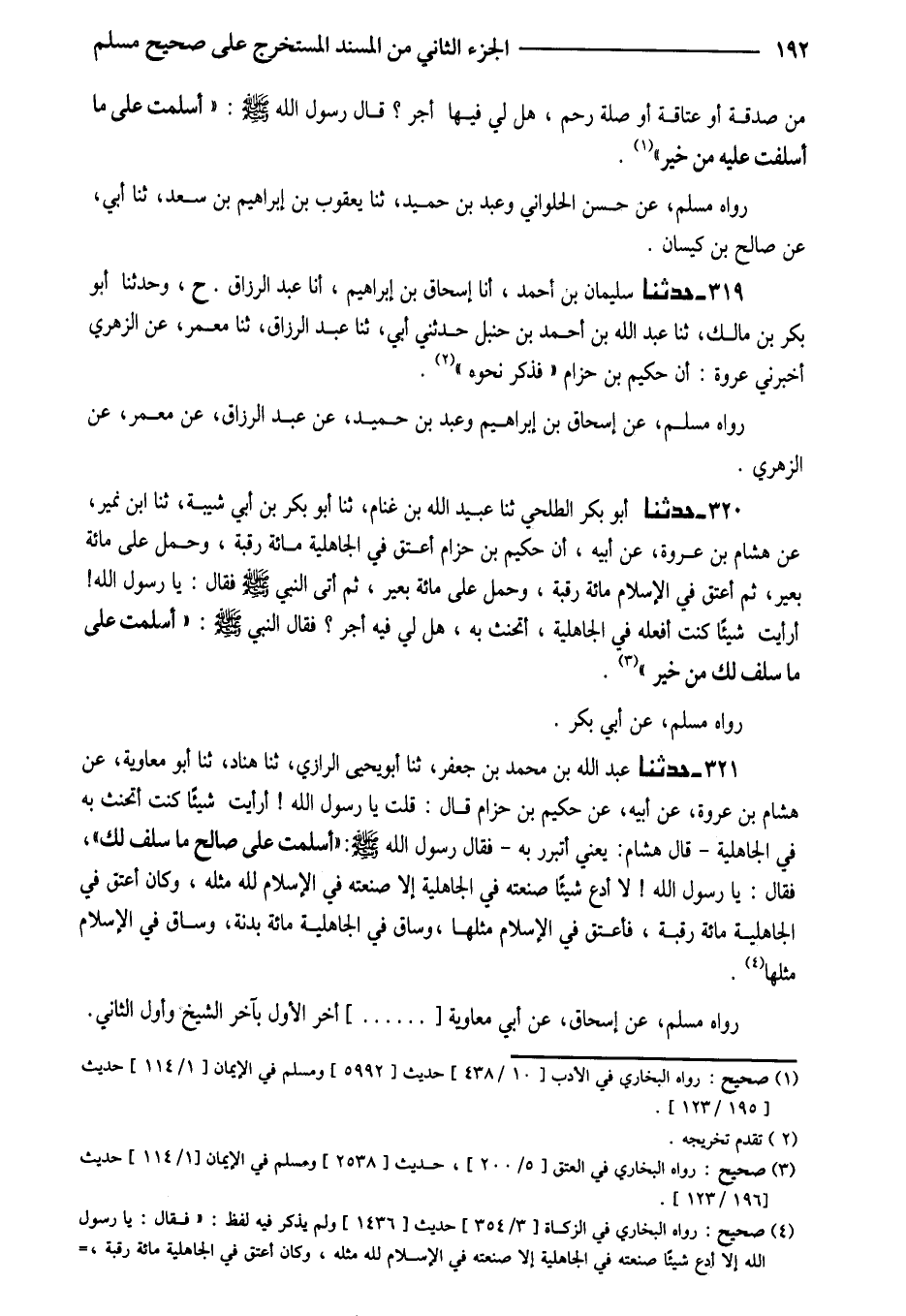 320 - حَدَّثَنَا أَبُو بَكْرٍ الطَّلْحِيُّ ثَنَا عُبَيْدُ اللَّهِ بْنُ غَنَّامٍ ثَنَا أَبُو بَكْرِ بْنُ أَبِي شَيْبَةَ ثَنَا ابْنُ نُمَيْرٍ عَنِ هِشَامِ بْنِ عُرْوَةَ عَنْ أَبِيهِ أَنَّ حَكِيمَ بْنَ حِزَامٍ أَعْتَقَ فِي الْجَاهِلِيَّةِ مِائَةَ رَقَبَةٍ وَحَمَلَ عَلَى مِائَةِ بَعِيرٍ ثُمَّ أَعْتَقَ فِي الإِسْلامِ مِائَةَ رَقَبَةٍ وَحَمَلَ عَلَى مِائَةِ بَعِيرٍ ثُمَّ أَتَى النَّبِيِّ صَلَّى اللَّهُ عَلَيْهِ وَسَلَّمَ فَقَالَ يَا رَسُولَ اللَّهِ أَرَأَيْتَ شَيْئًا كُنْتُ أَفْعَلُهُ فِي الْجَاهِلِيَّةِ أَتَحَنَّثُ بِهِ هَلْ لِي فِيهِ أَجْرٌ فَقَالَ النَّبِيُّ صَلَّى اللَّهُ عَلَيْهِ وَسَلَّمَ (أَسْلَمْتَ عَلَى مَا سلف لَك من خير) صَحِيحٌ