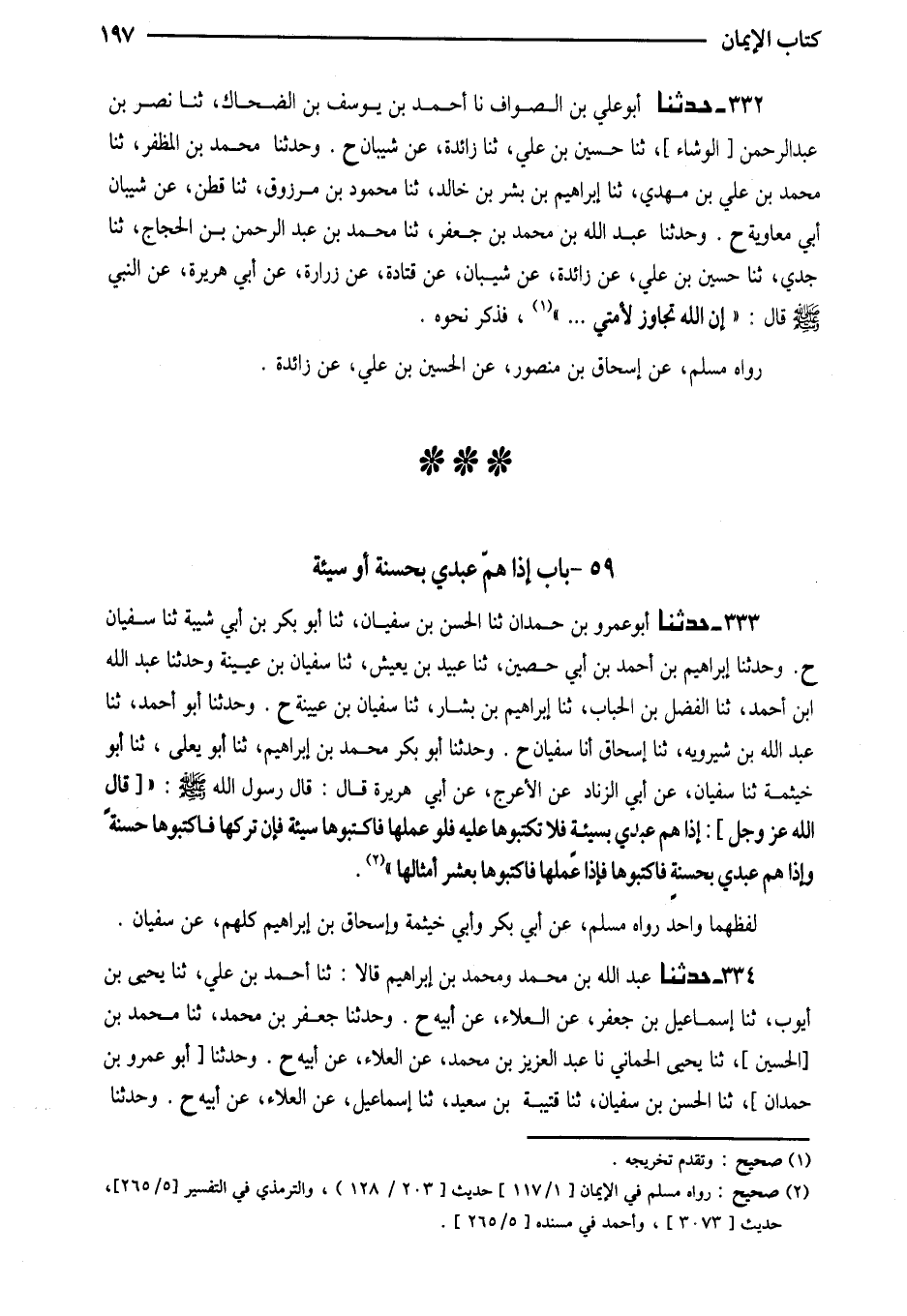 333 - حَدَّثَنَا أَبُو عَمْرِو بْنُ حَمْدَانَ ثَنَا الْحَسَنُ بْنُ سُفْيَانَ ثَنَا أَبُو بَكْرِ بْنُ أَبِي شَيْبَةَ ثَنَا سُفْيَانُ ح وَحَدَّثَنَا إِبْرَاهِيمُ بْنُ أَحْمَدَ بْنِ أَبِي حُصَيْنٍ ثَنَا عُبَيْدُ بْنُ يَعِيشَ ثَنَا سُفْيَانُ بْنُ عُيَيْنَةَ وَحَدَّثَنَا عَبْدُ اللَّهِ ابْن أَحْمَدَ ثَنَا الْفَضْلُ بْنُ الْحُبَابِ ثَنَا إِبْرَاهِيمُ بْنُ بَشَّارٍ ثَنَا سُفْيَانُ بْنُ عُيَيْنَةَ ح وَحَدَّثَنَا أَبُو أَحْمَدَ ثَنَا عَبْدُ اللَّهِ بْنُ شِيرَوَيْهِ ثَنَا إِسْحَاقُ أَنَا سُفْيَانَ ح وَحَدَّثَنَا أَبُو بَكْرٍ مُحَمَّدُ بْنُ إِبْرَاهِيمَ ثَنَا أَبُو يَعْلَى ثَنَا أَبُو خَيْثَمَةَ ثَنَا سُفْيَانُ عَنْ أَبِي الزِّنَادِ عَنِ الأَعْرَجِ عَنْ أَبِي هُرَيْرَةَ قَالَ قَالَ رَسُولُ اللَّهِ صَلَّى اللَّهُ عَلَيْهِ وَسَلَّمَ (قَالَ اللَّهُ عَزَّ وَجَلَّ إِذَا هَمَّ عَبْدِي بِسَيِّئَةٍ فَلا تَكْتُبُوهَا عَلَيْهِ فَلَوْ عَمِلَهَا فَاكْتُبُوهَا سَيِّئَةً فَإِنْ تَرَكَهَا فَاكْتُبُوهَا حَسَنَةً وَإِذَا هَمَّ عَبْدِي بِحَسَنَةٍ فَاكْتُبُوهَا فَإِذَا عَمِلَهَا فَاكْتُبُوهَا بِعَشْرٍ أَمْثَالهَا) صَحِيح لَفْظُهُمَا وَاحِدٌ رَوَاهُ مُسْلِمٌ عَنْ أَبِي بَكْرٍ وَأَبِي خَيْثَمَةَ وَإِسْحَاقَ بْنِ إِبْرَاهِيمَ كُلُّهُمْ عَنْ سُفْيَانَ
