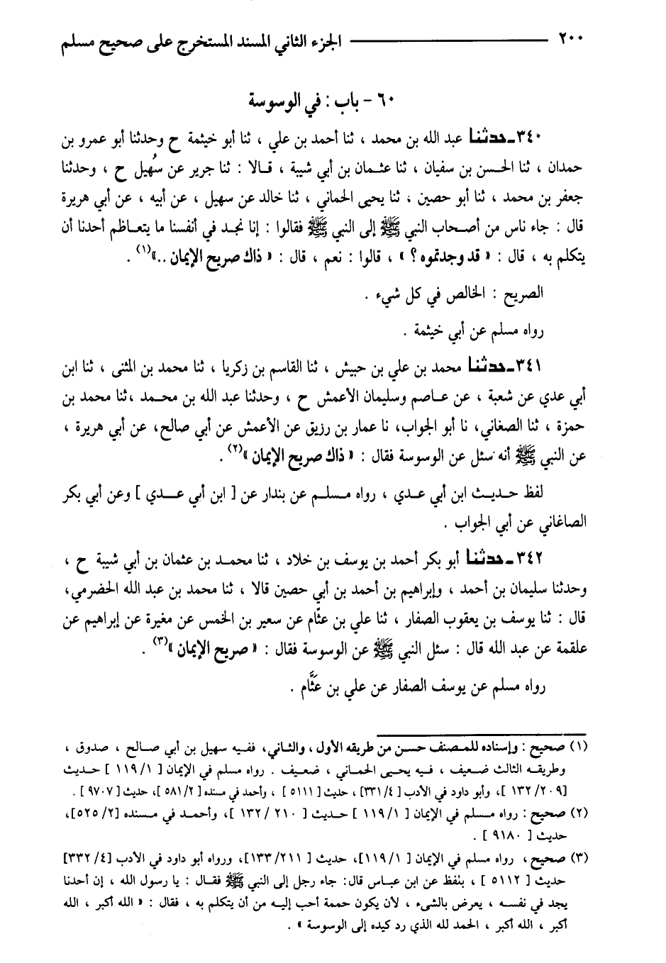 340 - حَدَّثَنَا عَبْدُ اللَّهِ بْنُ مُحَمَّدٍ ثَنَا أَحْمَدُ بْنُ عَلِيٍّ ثَنَا أَبُو خَيْثَمَةَ ح وَحَدَّثَنَا أَبُو عَمْرِو بْنُ حَمْدَانَ ثَنَا الْحَسَنُ بْنُ سُفْيَانَ ثَنَا عُثْمَانُ بْنُ أَبِي شَيْبَةَ قَالا ثَنَا جَرِيرٌ عَنْ سُهَيْلٍ ح وَحَدَّثَنَا جَعْفَرُ بْنُ مُحَمَّدِ ثَنَا أَبُو حُصَيْنٍ ثَنَا يَحْيَى الْحِمَّانِيُّ ثَنَا خَالِدٌ عَنْ سُهَيْلٍ عَنْ أَبِيهِ عَنْ أَبِي هُرَيْرَةَ قَالَ جَاءَ نَاسٌ مِنْ أَصْحَابِ النَّبِيِّ صَلَّى اللَّهُ عَلَيْهِ وَسَلَّمَ إِلَى النَّبِيِّ صَلَّى اللَّهُ عَلَيْهِ وَسَلَّمَ فَقَالُوا إِنَّا نَجِدُ فِي أَنْفُسِنَا مَا يَتَعَاظَمُ أَحَدُنَا أَنْ يَتَكَلَّمَ بِهِ قَالَ (قَدْ وَجَدْتُمُوهُ) قَالُوا نَعَمْ قَالَ (ذَاكَ صَرِيحُ الْإِيمَان) صَحِيح