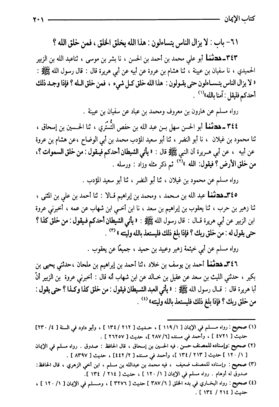 343 - حَدَّثَنَا أَبُو عَلِيٍّ مُحَمَّدُ بْنُ أَحْمَدَ بْنِ الْحَسَنِ نَا بِشْرُ بْنُ مُوسَى ثَنَا عَبْدُ اللَّهِ بْنُ الزُّبَيْرِ الْحُمَيْدِيُّ نَا سُفَيْانُ بْنُ عُيَيْنَةَ ثَنَا هِشَامُ بْنُ عُرْوَةَ عَنْ أَبِيهِ عَنْ أَبِي هُرَيْرَةَ قَالَ قَالَ رَسُولُ اللَّهِ صَلَّى اللَّهُ عَلَيْهِ وَسَلَّمَ (لَا يَزَالُ النَّاسُ يَتَسَاءَلُونَ حَتَّى يَقُولُونَ هَذَا اللَّهُ خَلَقَ كُلَّ شَيْءٍ فَمَنْ خَلَقَ اللَّهَ فَإِذَا وَجَدَ ذَلِكَ أحدكُم فَلْيقل آمنا بِاللَّه) صَحِيح