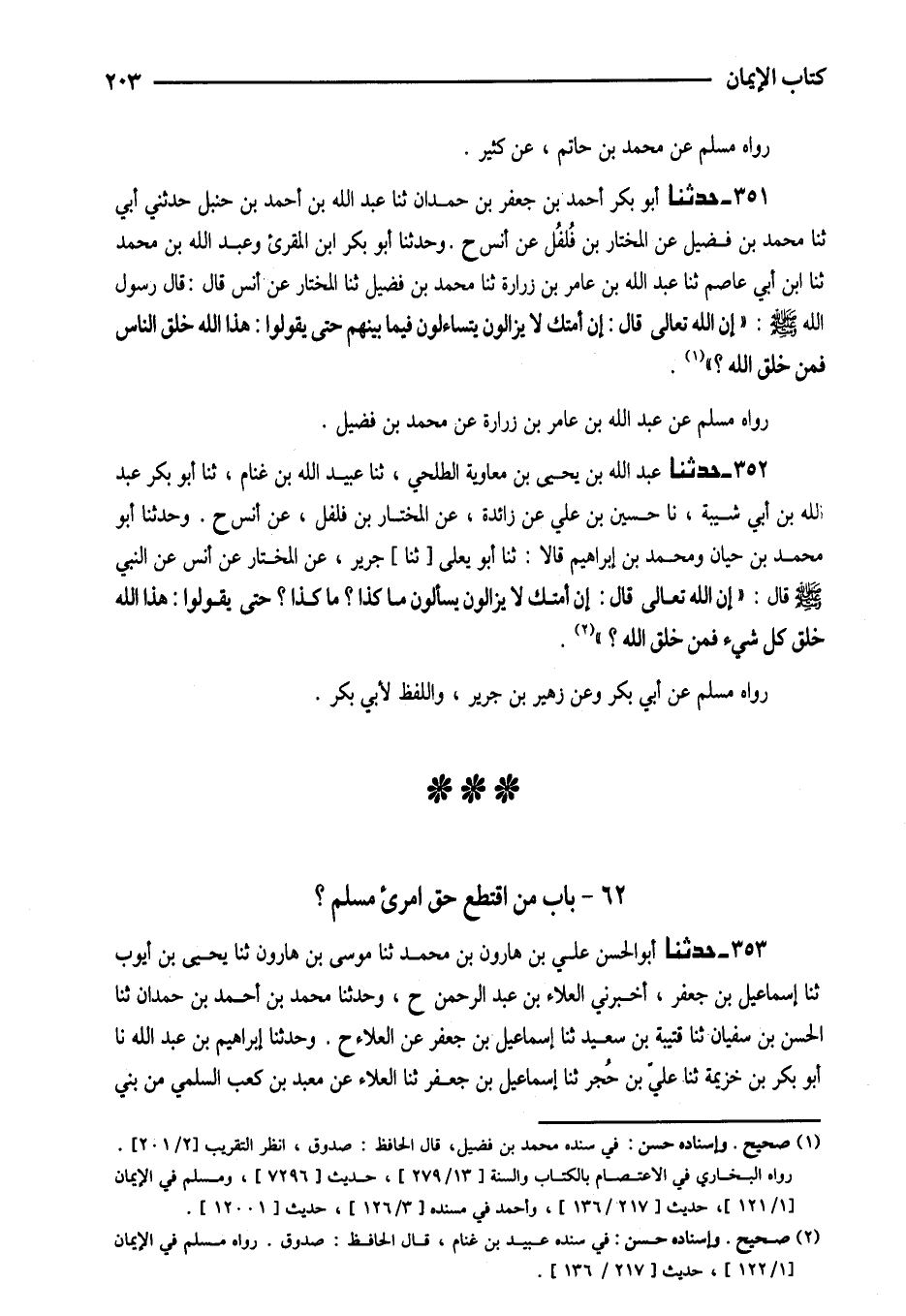 351 - حَدَّثَنَا أَبُو بَكْرٍ أَحْمَدُ بْنُ جَعْفَرِ بْنِ حَمْدَانَ ثَنَا عَبْدُ اللَّهِ بْنُ أَحْمَدَ بْنِ حَنْبَلٍ حَدَّثَنِي أَبِي ثَنَا مُحَمَّدُ بْنُ فُضَيْلٍ عَنِ الْمُخْتَارِ بْنِ فُلْفُلٍ عَنْ أَنَسٍ ح وَحدثنَا أَبُو بكر ابْن المقرىء وَعَبْدُ اللَّهِ بْنُ مُحَمَّدٍ ثَنَا ابْنُ أَبِي عَاصِمٍ ثَنَا عَبْدُ اللَّهِ بْنُ عَامِرِ بْنِ زُرَارَةَ ثَنَا مُحَمَّدُ بْنُ فُضَيْلٍ ثَنَا الْمُخْتَارُ عَنْ أَنَسٍ قَالَ قَالَ رَسُولُ اللَّهِ صَلَّى اللَّهُ عَلَيْهِ وَسَلَّمَ (إِنَّ اللَّهَ تَعَالَى قَالَ إِنَّ أُمَّتَكَ لَا يَزَالُونَ يَتَسَاءَلُونَ فِيمَا بَيْنَهُمْ حَتَّى يَقُولُوا هَذَا اللَّهُ خَلَقَ النَّاسَ فَمَنْ خَلَقَ اللَّهُ) صَحِيحٌ