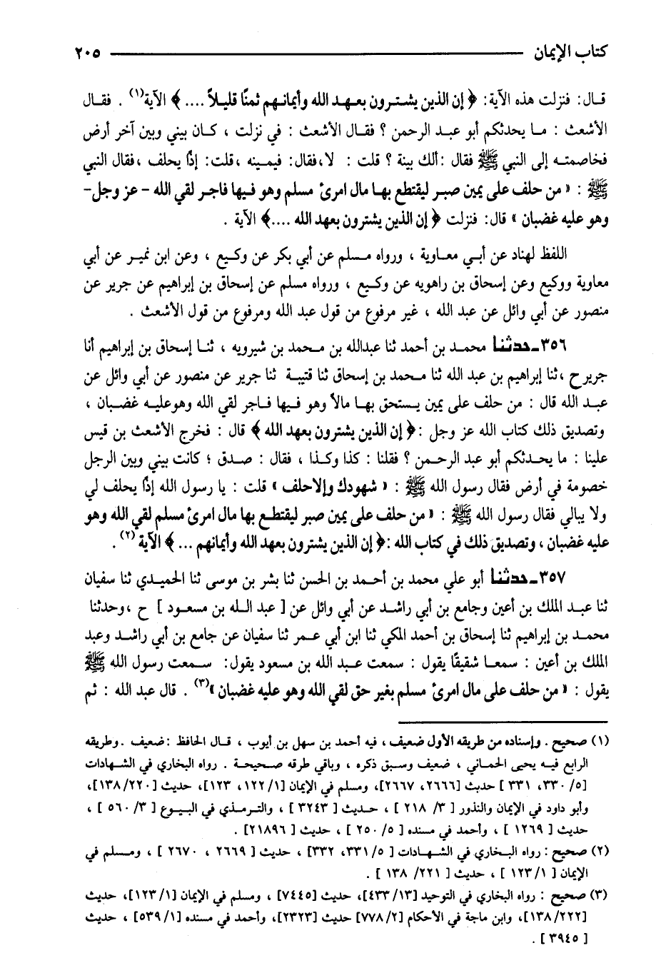 356 - حَدَّثَنَا مُحَمَّدُ بْنُ أَحْمَدَ ثَنَا عَبْدُ اللَّهِ بْنُ مُحَمَّدِ بْنُ شِيرَوَيْهِ ثَنَا إِسْحَاقُ بْنُ إِبْرَاهِيمَ أَنَا جَرِيرٌ ح ثَنَا إِبْرَاهِيمُ بْنُ عَبْدِ اللَّهِ ثَنَا مُحَمَّدُ بْنُ إِسْحَاقَ ثَنَا قُتَيْبَةُ ثَنَا جَرِيرٌ عَنْ مَنْصُورٍ عَنْ أَبِي وَائِلٍ عَنْ عَبْدِ اللَّهِ قَالَ مَنْ حَلَفَ عَلَى يمِينِ يَسْتَحِقُّ بِهَا مَالا وَهُوَ فِيهَا فَاجِرٌ لَقِيَ اللَّهَ وَهُوَ عَلَيْهِ غَضْبَانُ وَتَصْدِيقُ ذَلِكَ كِتَابُ اللَّهِ عَزَّ وَجَلَّ {إِنَّ الَّذِينَ يَشْتَرُونَ بِعَهْد الله} قَالَ فَخَرَجَ الأَشْعَثُ بْنُ قَيْسٍ عَلَيْنَا مَا يُحَدِّثُكُمْ أَبُو عَبْدِ الرَّحْمَنِ فَقُلْنَا كَذَا وَكَذَا فَقَالَ صَدَقَ كَانَتْ بَيْنِي وَبَيْنَ الرَّجُلِ خُصَومَةٌ فِي أَرْضٍ فَقَالَ رَسُولُ اللَّهِ صَلَّى اللَّهُ عَلَيْهِ وَسَلَّمَ (شُهُودُكَ وَإِلا حَلَفَ) قُلْتُ يَا رَسُولَ اللَّهِ إِذًا يَحْلِفُ لِي وَلا يُبَالِي فَقَالَ رَسُولُ اللَّهِ صَلَّى اللَّهُ عَلَيْهِ وَسَلَّمَ (مِنْ حَلَفَ عَلَى يمِينِ صَبْرٍ لِيَقْتَطِعَ بهَا مَال امرىء مُسْلِمٍ لَقِيَ اللَّهَ وَهُوَ عَلَيْهِ غَضْبَانُ وَتَصْدِيقُ ذَلِكَ فِي كِتَابِ اللَّهِ {إِنَّ الَّذِينَ يَشْتَرُونَ بِعَهْدِ الله وَأَيْمَانهمْ} الأية 2 صَحِيح