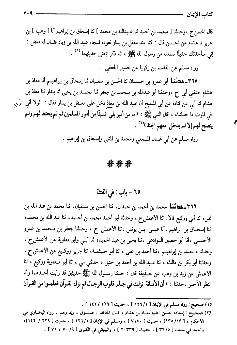 365 - حَدَّثَنَا أَبُو عَمْرِو بْنُ حَمْدَانَ ثَنَا الْحَسَنُ بْنُ سُفْيَانَ ثَنَا إِسْحَاقُ بْنُ إِبْرَاهِيمَ أَنَا مُعَاذُ بْنُ هِشَامٍ حَدَّثَنِي أَبِي ح وَحَدَّثَنَا أَبُو عَبْدِ اللَّهِ بْنُ مُحَمَّدِ بْنِ جَعْفَرٍ ثَنَا مُحَمَّدُ بْنُ يَحْيَى ثَنَا بُنْدَارٌ ثَنَا مُعَاذُ بْنُ هِشَامٍ ثَنَا أَبِي عَنْ قَتَادَةَ عَنْ أَبِي الْمَلِيحِ أَنَّ عُبَيْدَ اللَّهِ بْنَ مُعَاذٍ دَخَلَ عَلَى مَعْقِلِ بْنِ يَسَارٍ فَقَالَ لَوْلا أَنِّي فِي الْمَوْتِ مَا حَدَّثْتُكَ قَالَ النَّبِيُّ صَلَّى اللَّهُ عَلَيْهِ وَسَلَّمَ (مَا مِنْ أَمِيرٍ يَلِي شَيْئًا مِنْ أُمُورِ الْمُسْلِمِينَ ثُمَّ لَمْ يَحْتَطْ لَهُمْ وَلَمْ يَنْصَحْ لَهُمْ إِلا لَمْ يَدْخُلْ مَعَهم الْجنَّة) صَحِيح إِسْنَاده حَسَنٌ