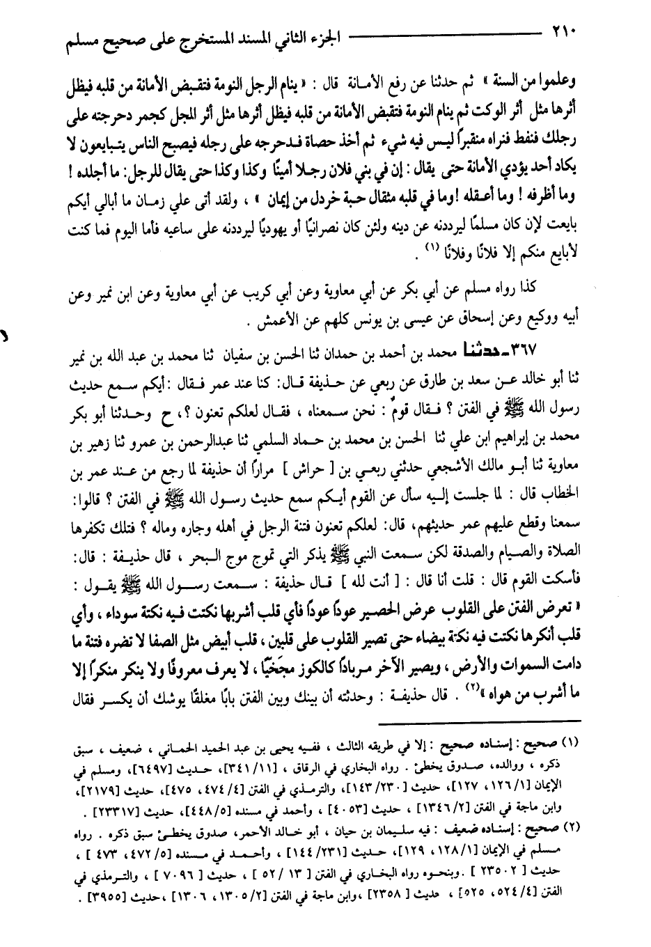 367 - حَدَّثَنَا مُحَمَّدُ بْنُ أَحْمَدَ بْنِ حَمْدَانَ ثَنَا الْحَسَنُ بْنُ سُفْيَانَ ثَنَا مُحَمَّدُ بْنُ عَبْدِ اللَّهِ بْنِ نُمَيْرٍ ثَنَا أَبُو خَالِدٍ عَنْ سَعْدِ بْنِ طَارِقٍ عَنْ رِبْعِيٍّ عَنْ حُذَيْفَةَ قَالَ كُنَّا عِنْدَ عُمَرَ فَقَالَ أَيُّكُمْ سَمِعَ حَدِيثِ رَسُولِ اللَّهِ صَلَّى اللَّهُ عَلَيْهِ وَسَلَّمَ فِي الْفِتَنِ فَقَالَ قَوْمٌ نَحْنُ سَمِعْنَاهُ فَقَالَ لَعَلَّكُمْ تَعْنُونَ ح وَحَدَّثَنَا أَبُو بَكْرٍ مُحَمَّد بن إِبْرَاهِيم ابْن عَلِيٍّ ثَنَا الْحَسَنُ بْنُ مُحَمَّدِ بْنِ حَمَّادٍ السُّلَمِيُّ ثَنَا عَبْدُ الرَّحْمَنِ بْنُ عَمْرٍو ثَنَا زُهَيْرُ بْنُ مُعَاوِيَةَ ثَنَا أَبُو مَالِكٍ الأَشْجَعِيُّ حَدَّثَنِي رِبْعِيُّ بْنُ حِرَاشٍ مِرَارًا أَنَّ حُذَيْفَةَ لَمَّا رَجَعَ مِنْ عِنْدَ عُمَرَ بْنِ الْخَطَّابِ قَالَ لَمَّا جَلَسْتُ إِلَيْهِ سَأَلَ عَنِ الْقَوْمِ أَيُّكُمْ سَمِعَ حَدِيثَ رَسُولُ اللَّهِ صَلَّى اللَّهُ عَلَيْهِ وَسَلَّمَ فِي الْفِتَنِ قَالُوا سَمِعْنَا وَقَطَعَ عَلَيْهِمْ عُمَرُ حَدِيثَهُمْ قَالَ لَعَلَّكُمْ تَعْنُونَ فِتْنَةَ الرَّجُلِ فِي أَهْلِهِ وَجَارِهِ وَمَالِهِ فَتِلْكَ تُكَفِّرُهَا الصَّلاةُ وَالصِّيَامُ وَالصَّدَقَةُ لَكِنْ سَمِعْتُ النَّبِيِّ صَلَّى اللَّهُ عَلَيْهِ وَسَلَّمَ يَذْكُرُ الَّتِي تَمُوجُ مَوْجَ الْبَحْرِ قَالَ حُذَيْفَةُ قَالَ فَأَسْكَتَ الْقَوْمَ قَالَ قُلْتُ أَنَا قَالَ أَنْتَ لِلَّهِ قَالَ حُذَيْفَةُ سَمِعْتُ رَسُولَ اللَّهِ صَلَّى اللَّهُ عَلَيْهِ وَسَلَّمَ يَقُولُ (تُعْرَضُ الْفِتَنُ عَلَى الْقُلُوبِ عَرْضَ الْحَصِيرِ عُودًا عُودًا فَأَيُّ قَلْبٍ أُشْرِبَهَا نُكِتَتْ فِيهِ نُكْتَةٌ سَوْدَاءُ وَأَيُّ قَلْبٍ أَنْكَرَهَا نُكِتَتْ فِيهِ نُكْتَةٌ بَيْضَاءُ حَتَّى تَصِيرَ الْقُلُوبُ عَلَى قَلْبَيْنِ قَلْبٌ أَبْيَضٌ مِثْلَ الصَّفَا لَا تَضُرُّهُ فِتْنَةٌ مَا دَامَتِ السَّمَوَاتُ وَالأَرْضُ وَيَصِيرُ الآخَرُ مُرْبَادًّا كَالْكُوزِ مُجَخِّيًا لَا يَعْرِفُ مَعْرُوفًا وَلا يُنْكِرُ مُنْكَرًا إِلا مَا أُشْرِبَ مِنْ هَوَاهُ) قَالَ حُذَيْفَةُ وَحَدَّثْتُهُ أَنَّ بَيْنَكَ وَبَيْنَ الْفِتَنِ بَابًا مُغْلَقًا يُوشِكُ أَن يُوشِكُ أَنْ يُكْسَرَ فَقَالَ
