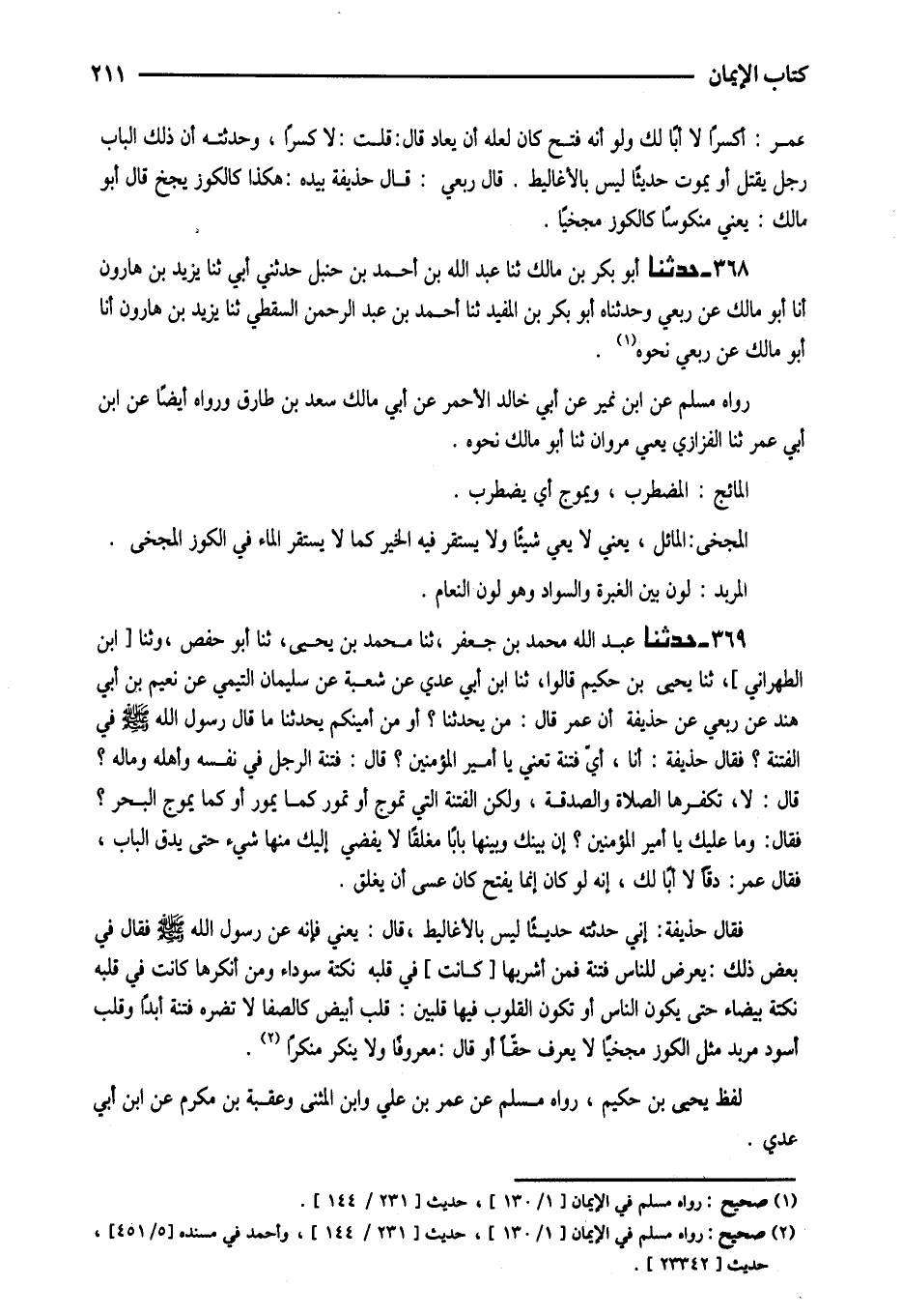 369 - حَدَّثَنَا عَبْدُ اللَّهِ مُحَمَّدُ بْنُ جَعْفَرٍ ثَنَا مُحَمَّدُ بْنُ يَحْيَى ثَنَا أَبُو حَفْصٍ وَثَنَا ابْنُ الطَّهْرَانِيِّ ثَنَا يَحْيَى بْنُ حَكِيمٍ قَالُوا ثَنَا ابْنُ أَبِي عَدِيٍّ عَنْ شُعْبَةَ عَنْ سُلَيْمَانَ التَّيْمِيِّ عَنْ نُعَيْمِ بْنِ أَبِي هِنْدٍ عَنْ رِبْعِيٍّ عَنْ حُذَيْفَةَ أَنَّ عُمَرَ قَالَ مَنْ يُحَدِّثُنَا أَوْ مَنْ أَمِينُكُمْ يُحَدِّثُنَا مَا قَالَ رَسُولُ اللَّهِ صَلَّى اللَّهُ عَلَيْهِ وَسَلَّمَ فِي الْفِتْنَةِ فَقَالَ حُذَيْفَةُ أَنَا أَيُّ فِتْنَةٍ تَعْنِي يَا أَمِيرَ الْمُؤْمِنِينَ قَالَ فِتْنَةُ الرَّجُلِ فِي نَفْسِهِ وَأَهْلِهِ وَمَالِهِ قَالَ لَا تُكَفِّرُهَا الصَّلاةُ وَالصَّدَقَةُ وَلَكِنَّ الْفِتْنَةَ الَّتِي تَمُوجُ أَوْ تَمُورُ كَمَا يَمُورُ أَوْ كَمَا يَمُوجُ الْبَحْرُ فَقَالَ وَمَا عَلَيْكَ يَا أَمِيرَ الْمُؤْمِنِينَ إِنَّ بَيْنَكَ وَبَيْنَهَا بَابًا مُغْلَقًا لَا يُفْضِي إِلَيْكَ مِنْهَا شَيْءٌ حَتَّى يُدَقَّ الْبَابُ فَقَالَ عُمَرُ دَقًّا لَا أَبًا لَكَ إِنَّهُ لَوْ كَانَ إِنَّمَا يُفْتَحُ كَانَ عَسَى أَنْ يُغْلَقَ