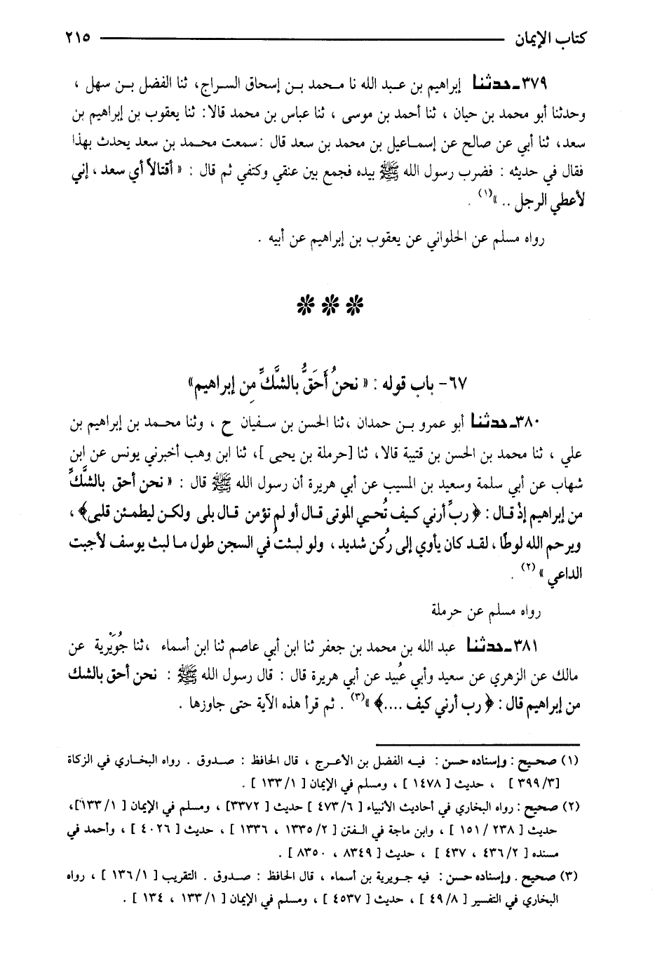 380 - حَدَّثَنَا أَبُو عَمْرِو بْنُ حَمْدَانَ ثَنَا الْحَسَنُ بْنُ سُفْيَانَ ح وَثَنَا مُحَمَّدُ بْنُ إِبْرَاهِيمَ بْنِ عَلِيٍّ ثَنَا مُحَمَّدُ بْنُ الْحَسَنِ بْنِ قُتَيْبَةَ قَالا ثَنَا حَرْمَلَةُ بْنُ يَحْيَى ثَنَا ابْنُ وَهْبٍ أَخْبَرَنِي يُونُسُ عَنِ ابْنِ شِهَابٍ عَنْ أَبِي سَلَمَةَ وَسَعِيدِ بْنِ الْمُسَيِّبِ عَنْ أَبِي هُرَيْرَةَ أَنَّ الرَّسُولَ صَلَّى اللَّهُ عَلَيْهِ وَسَلَّمَ قَالَ (نَحْنُ أَحَقُّ بِالشَّكِّ مِنْ إِبْرَاهِيمَ إِذْ قَالَ {رَبِّ أَرِنِي كَيْفَ تحيي الْمَوْتَى قَالَ أَو لم تُؤْمِنْ قَالَ بَلَى وَلَكِنْ لِيَطْمَئِنَّ قلبِي} وَيَرْحَمُ اللَّهُ لُوطًا لَقَدْ كَانَ يَأْوِي إِلَى رُكْنٍ شَدِيدٍ وَلَوْ لَبِثْتُ فِي السِّجْنِ طُولَ مَا لبث يُوسُف لَأَجَبْت الدَّاعِي) صَحِيح