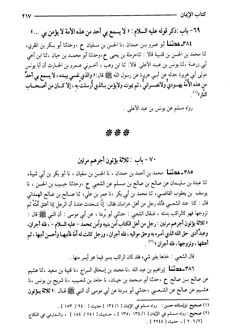 385 - حَدَّثَنَا مُحَمَّدُ بْنُ أَحْمَدَ بْنِ حَمْدَانَ ثَنَا الْحَسَنُ بْنُ سُفْيَانَ ثَنَا أَبُو بَكْرِ بْنُ أَبِي شَيْبَةَ ثَنَا عَبْدَةُ بْنُ سُلَيْمَانَ عَنْ صَالِحِ بْنِ صَالِحِ بْنِ مُسْلِمٍ عَنِ الشَّعْبِيِّ ح وَحَدَّثَنَا حَبِيبُ بْنُ الْحَسَنِ نَا يُوسُفُ بْنُ يَعْقُوبَ الْقَاضِي ثَنَا مُحَمَّدُ بْنُ أَبِي بَكْرٍ نَا عُمَرُ بْنُ عَلِيٍّ ثَنَا صَالِحُ بْنُ صَالِحٍ الْهَمَدَانِيُّ قَالَ كُنَّا عِنْدَ الشَّعْبِيِّ فَأَتَاهُ رَجُلٌ مِنْ أَهْلِ خُرَاسَانَ فَقَالَ إِنَّا نَتَحَدَّثُ عِنْدَنَا أَنَّ الرَّجُلَ إِذَا أَعْتَقَ أَمَتَهُ ثُمَّ نزوجها فَهُوَ كَالرَّاكِبِ بَدَنَتَهُ فَقَالَ الشَّعْبِيُّ حَدَّثَنِي أَبُو بُرْدَةَ عَنْ أَبِي مُوسَى أَنَّ النَّبِيَّ صَلَّى اللَّهُ عَلَيْهِ وَسَلَّمَ قَالَ (ثَلاثَةٌ يُؤْتَوْنَ أَجْرَهُمْ مَرَّتَيْنِ رَجُلٌ مِنْ أَهْلِ الْكِتَابِ آمَنَ بِنَبِيِّهِ وَآمَنَ بِمُحَمَّدٍ صَلَّى اللَّهُ عَلَيْهِ وَسَلَّمَ فَلَهُ أَجْرَانِ وَعَبْدٌ أَدَّى حَقَّ اللَّهِ الَّذِي أَمَرَهُ بِهِ وَحَقَّ مَوَالِيهِ فَلَهُ أَجْرَانِ وَرَجُلٌ كَانَتْ لَهُ أَمَةٌ فَأَدَّبَهَا وَأَحْسَنَ أَدَبَهَا ثُمَّ أعْتقهَا وَتَزَوجهَا فَلهُ أَجْرَانِ) صَحِيح قَالَ الشَّعْبِيُّ خُذْهَا بِغَيْرِ شَيْءٍ فَقَدْ كَانَ الرَّاكِبُ يَسِيرُ فِيمَا هُوَ أَيْسَرُ مِنْهَا