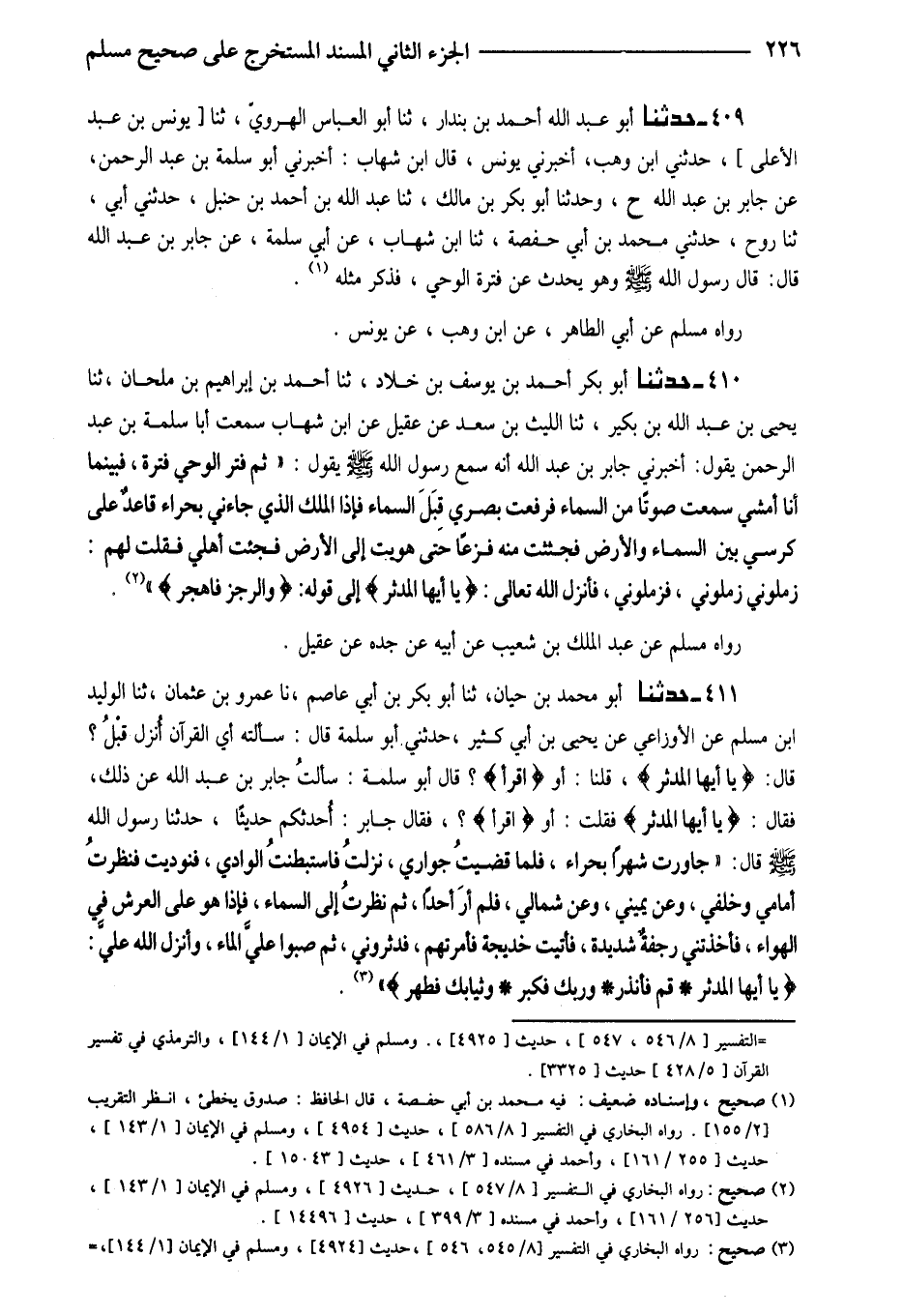 410 - حَدَّثَنَا أَبُو بَكْرٍ أَحْمَدُ بْنُ يُوسُفَ بْنِ خَلادٍ ثَنَا أَحْمَدُ بْنُ إِبْرَاهِيمَ بْنِ مِلْحَانَ ثَنَا يَحْيَى بْنُ عَبْدِ اللَّهِ بْنِ بُكَيْرٍ ثَنَا اللَّيْثُ بْنُ سَعْدٍ عَنْ عُقَيْلٍ عَنِ ابْنِ شِهَابٍ سَمِعْتُ أَبَا سَلَمَةَ بْنَ عَبْدِ الرَّحْمَنِ يَقُولُ أَخْبَرَنِي جَابِرُ بْنُ عَبْدِ اللَّهِ أَنَّهُ سَمِعَ رَسُولَ اللَّهِ صَلَّى اللَّهُ عَلَيْهِ وَسَلَّمَ يَقُولُ (ثُمَّ فَتَرَ الْوَحْيُ فَتْرَةً فَبَيْنَمَا أَنَا أَمْشِي سَمِعْتُ صَوْتًا مِنَ السَّمَاءِ فَرَفَعْتُ بَصَرِي قِبَلَ السَّمَاءِ فَإِذَا الْمَلَكُ الَّذِي جَاءَنِي بِحِرَاءٍ قَاعِدٌ عَلَى كُرْسِيٍّ بَيْنَ السَّمَاءِ وَالأَرْضِ فَجَثَثْتُ مِنْهُ فَزَعًا حَتَّى هَوَيْتُ إِلَى الأَرْضِ فَجِئْتُ أَهْلِي فَقُلْتُ لَهُمْ زَمِّلُونِي زَمِّلُونِي فَزَمَّلُونِي فَأَنْزَلَ اللَّهُ تَعَالَى {يَا أَيهَا المدثر} إِلَى قَوْلِهِ {وَالرُّجْزَ فَاهْجُرْ} صَحِيح
