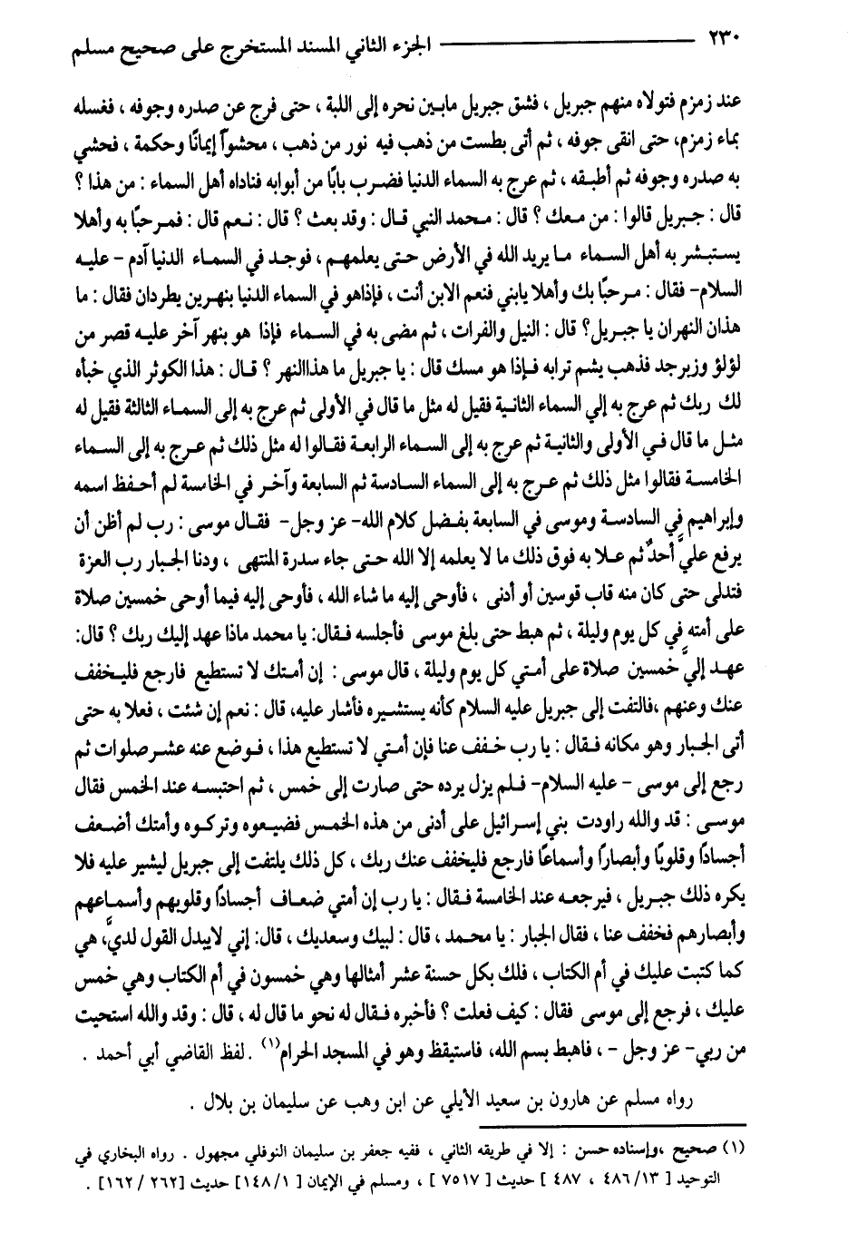 عِنْدَ زَمْزَمَ فَتَوَلاهُ مِنْهُمْ جِبْرِيلُ فَشَقَّ جِبْرِيلُ مَا بَيْنَ نَحْرِهِ إِلَى اللَّبَّةِ حَتَّى فَرَجَ عَنْ صَدْرِهِ وَجَوْفِهِ فَغَسَلَهُ بِمَاءِ زَمْزَمَ حَتَّى أَنْقَى جَوْفَهُ ثُمَّ أَتَى بِطَسْتٍ مِنْ ذَهَبٍ فِيهِ نُورٌ مِنْ ذَهَبٍ مَحْشُوًّا إِيمَانًا وَحِكْمَةً فحشي بِهِ صَدْرَهُ وَجَوْفَهُ ثُمَّ أَطْبَقَهُ ثمَّ عرج بِهِ السَّمَاءِ الدُّنْيَا فَضَرَبَ بَابًا مِنْ أَبْوَابِهِ فَنَادَاهُ أَهْلُ السَّمَاءِ مَنْ هَذَا قَالَ جِبْرِيلُ قَالُوا مَنْ مَعَك قَالَ مُحَمَّد النَّبِي وَقَدْ بُعِثَ قَالَ نَعَمْ قَالَ فَمَرْحَبًا بِهِ وَأَهْلا يَسْتَبْشِرُ بِهِ أَهْلُ السَّمَاءِ مَا يُرِيدُ اللَّهُ فِي الأَرْضِ حَتَّى يُعْلِمَهُمْ فَوَجَدَ فِي السَّمَاءِ الدُّنْيَا آدَمَ عَلَيْهِ السَّلامُ فَقَالَ مَرْحَبًا بِكَ وَأَهْلا يَا بُنَيَّ فَنِعْمَ الابْنُ أَنْتَ فَإِذَا هُوَ فِي السَّمَاءِ الدُّنْيَا بِنَهْرَيْنِ يَطَّرِدَانِ فَقَالَ مَا هَذَانِ النَّهْرَانِ يَا جِبْرِيلُ قَالَ النِّيلُ وَالْفُرَاتُ ثُمَّ مَضَى بِهِ فِي السَّمَاءِ فَإِذَا هُوَ بِنَهْرٍ آخَرَ عَلَيْهِ قَصْرٌ مِنْ لُؤْلُؤٍ وَزَبَرْجَدٍ فَذَهَبَ يَشُمُّ تُرَابَهُ فَإِذَا هُوَ مِسْكٌ قَالَ يَا جِبْرِيلُ مَا هَذَا النَّهْرُ قَالَ هَذَا الْكَوْثَرُ الَّذِي خَبَّأَهُ لَكَ رَبُّكَ ثُمَّ عرج إِلَى السَّمَاءِ الثَّانِيَةِ فَقِيلَ لَهُ مِثْلَ مَا قَالَ فِي الْأُولَى ثُمَّ عَرَجَ بِهِ إِلَى السَّمَاءِ الثَّالِثَةِ فَقِيلَ لَهُ مِثْلَ مَا قَالَ فِي الْأُولَى وَالثَّانِيَةِ ثُمَّ عرج إِلَى السَّمَاءِ الرَّابِعَةِ فَقَالُوا لَهُ مِثْلَ ذَلِكَ ثُمَّ عَرَجَ بِهِ إِلَى السَّمَاءِ الْخَامِسَةِ فَقَالُوا مِثْلَ ذَلِكَ ثُمَّ عَرَجَ بِهِ إِلَى السَّمَاء السادسه ثمَّ السَّابِعَة وَآخَرَ فِي الْخَامِسَةِ لَمْ أَحْفَظِ اسْمَهُ وَإِبْرَاهِيمَ فِي السَّادِسَةِ وَمُوسَى فِي السَّابِعَةِ بِفَضْلِ كَلامِ اللَّهِ عَزَّ وَجَلَّ فَقَالَ مُوسَى رَبِّ لَمْ أَظُنَّ أَنْ يُرْفَعَ عَلَيَّ أَحَدٌ ثُمَّ عَلا بِهِ فَوْقَ ذَلِكَ مَا لَا يَعْلَمُهُ إِلا اللَّهُ حَتَّى جَاءَ سِدْرَةَ الْمُنْتَهَى وَدَنَا الْجَبَّارُ رَبُّ الْعِزَّةِ فَتَدَلَّى حَتَّى كَانَ مِنْهُ قَابَ قَوْسَيْنِ أَوْ أَدْنَى فَأَوْحَى إِلَيْهِ مَا شَاءَ اللَّهُ فَأَوْحَى إِلَيْهِ فِيمَا أَوْحَى خَمْسِينَ صَلاةً عَلَى أُمَّتِهِ فِي كُلِّ يَوْمٍ وَلَيْلَةٍ ثُمَّ هَبَطَ حَتَّى بَلَغَ مُوسَى فَأَجْلَسَهُ فَقَالَ يَا مُحَمَّدُ مَاذَا عَهِدَ إِلَيْكَ رَبُّكَ قَالَ عَهِدَ إِلَيَّ خَمْسِينَ صَلاةً عَلَى أُمَّتِي كُلَّ يَوْمٍ وَلَيْلَةٍ قَالَ مُوسَى إِنَّ أُمَّتَكَ لَا تَسْتَطِيعُ فَارْجِعْ فَلْيُخَفِّفْ عَنْكَ وَعَنْهُمْ فَالْتَفَتَ إِلَى جِبْرِيلَ عَلَيْهِ السَّلامُ كَأَنَّهُ يَسْتَشِيرُهُ فَأَشَارَ عَلَيْهِ قَالَ نَعَمْ إِنْ شِئْتَ فَعَلا بِهِ حَتَّى أَتَى الْجَبَّارَ وَهُوَ مَكَانُهُ فَقَالَ يَا رَبِّ خفف عَنَّا فَإِنَّ أُمَّتِي لَا تَسْتَطِيعُ هَذَا فَوَضَعَ عَنْهُ عَشْرَ صَلَوَاتٍ ثُمَّ رَجَعَ إِلَى مُوسَى عَلَيْهِ السَّلامُ فَلَمْ يَزَلْ يَرُدُّهُ حَتَّى صَارَتْ إِلَى خَمْسٍ ثُمَّ احْتَبَسَهُ عِنْدَ الْخَمْسِ فَقَالَ مُوسَى قَدْ وَاللَّهِ رَاوَدْتُ بَنِي إِسْرَائِيلَ عَلَى أَدْنَى مِنْ هَذِهِ الْخَمْسِ فَضَيَّعُوهُ وَتَرَكُوهُ وَأُمَّتُكَ أَضْعَفُ أَجْسَادًا وَقُلُوبًا وَأَبْصَارًا وَأَسْمَاعًا فَارْجِعْ فَلْيُخَفِّفْ عَنْكَ رَبُّكَ كُلَّ ذَلِكَ يَلْتَفِتُ إِلَى جِبْرِيلَ لِيُشِيرَ عَلَيْهِ فَلا يَكْرَهُ ذَلِكَ جِبْرِيلُ فَيُرْجِعُهُ عِنْدَ الْخَامِسَةِ فَقَالَ يَا رَبِّ إِنَّ أُمَّتِي ضِعَافُ أجسادا وَقُلُوبهمْ وأسماعهم وأبصارهم فَخفف عَنَّا فَقَالَ الْج