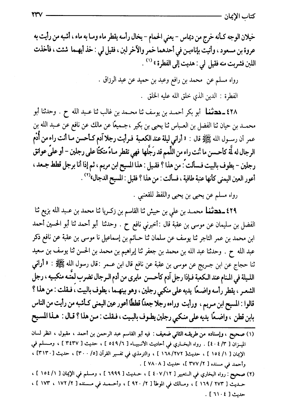 خِيلانِ الْوَجْهِ كَأَنَّهُ خَرَجَ مِنْ دِيمَاسٍ يَعْنِي الْحَمَّامُ يُخَالُ رَأْسُهُ يَقْطُرُ مَاءً وَمَا بِهِ مَاءٌ أَشْبَهُ مَنْ رَأَيْتُ بِهِ عُرْوَةُ بْنُ مَسْعُودٍ وَأُتِيتُ بِإِنَاءَيْنِ فِي أَحَدِهِمَا خَمْرٌ وَالآخَرِ لَبَنٌ فَقِيلَ لِي خُذْ أَيُّهُمَا شِئْتَ فَأَخَذْتُ اللَّبَنَ فَشَرِبْتُ مِنْهُ فَقِيلَ لِي هديت إِلَى الْفطْرَة) صَحِيح وَإِسْنَاده من طَرِيقه الثَّانِي ضَعِيفٌ