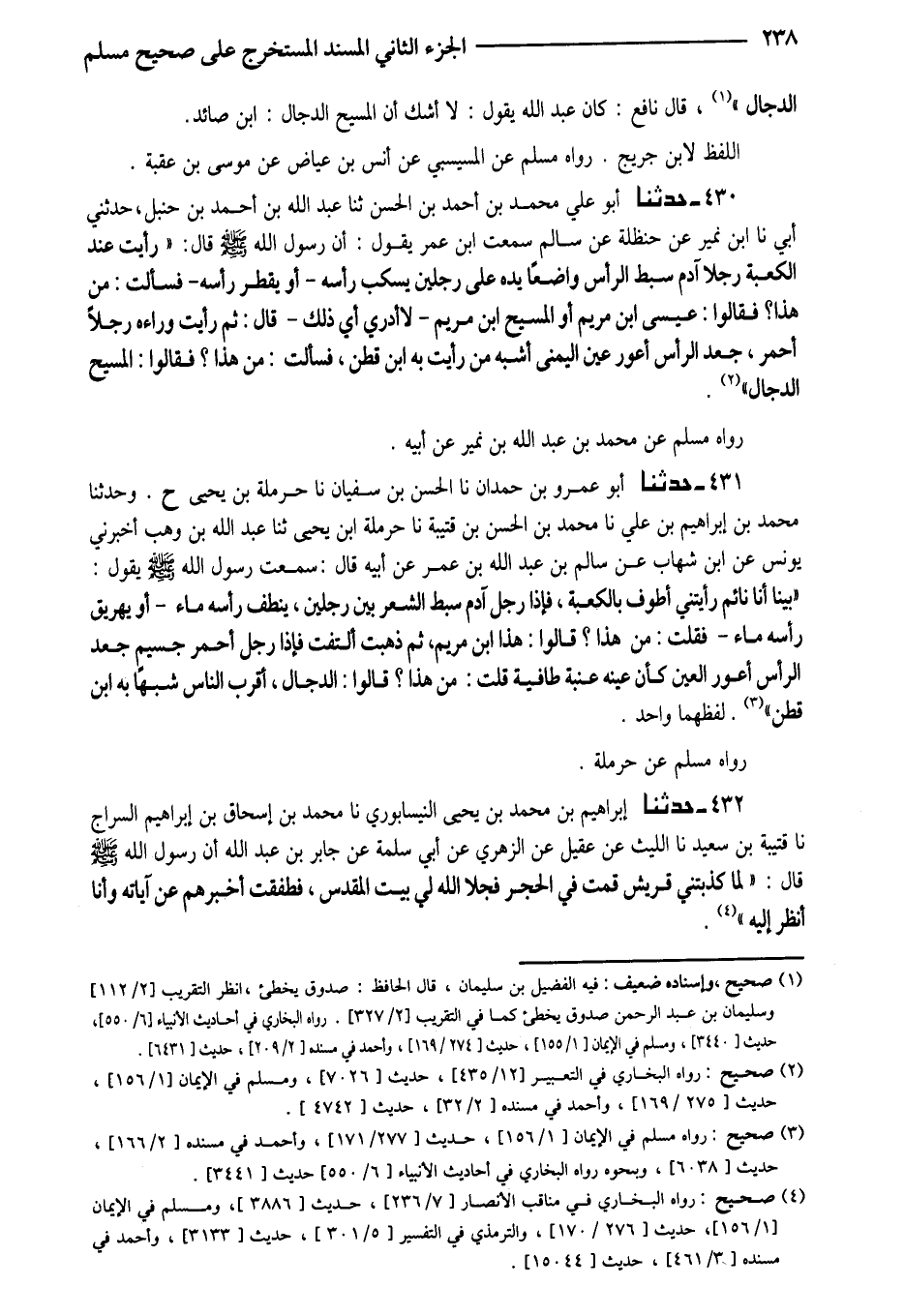 431 - حَدَّثَنَا أَبُو عَمْرِو بْنُ حَمْدَانَ نَا الْحَسَنُ بْنُ سُفْيَانَ نَا حَرْمَلَةُ بْنُ يَحْيَى ح وَحَدَّثَنَا مُحَمَّدُ بْنُ إِبْرَاهِيمَ بْنِ عَلِيٍّ نَا مُحَمَّدُ بْنُ الْحَسَنِ بن قُتَيْبَة نَا حَرْمَلَة ابْن يَحْيَى ثَنَا عَبْدُ اللَّهِ بْنُ وهب أَخْبرنِي ريونس عَنِ ابْنِ شِهَابٍ عَنْ سَالِمِ بْنُ عَبْدِ اللَّهِ بْنِ عُمَرَ عَنْ أَبِيهِ قَالَ سَمِعْتُ رَسُولَ اللَّهِ صَلَّى اللَّهُ عَلَيْهِ وَسَلَّمَ يَقُولُ (بَيْنَا أَنَا نَائِمٌ رَأَيْتُنِي أطواف بِالْكَعْبَةِ فَإِذَا رَجُلٌ آدَمُ سَبْطُ الشَّعْرِ بَيْنَ رَجُلَيْنِ يَنْطِفُ رَأْسُهُ مَاءً أَوْ يُهْرِيقُ رَأْسُهُ مَاءً فَقُلْتُ مَنْ هَذَا قَالُوا هَذَا ابْنُ مَرْيَمَ ثُمَّ ذَهَبْتُ أَلْتَفِتُ فَإِذَا رَجُلٌ أَحْمَرُ جَسِيمٌ جَعْدُ الرَّأْسِ أَعْوَرُ الْعَيْنِ كَأَنَّ عَيْنَهُ طَافِيَةٌ قُلْتُ مَنْ هَذَا قَالُوا الدَّجَّالُ أَقْرَبُ النَّاسِ شَبَهًا بِهِ ابْن قطن) لَفْظهمَا وَاحِد صَحِيح