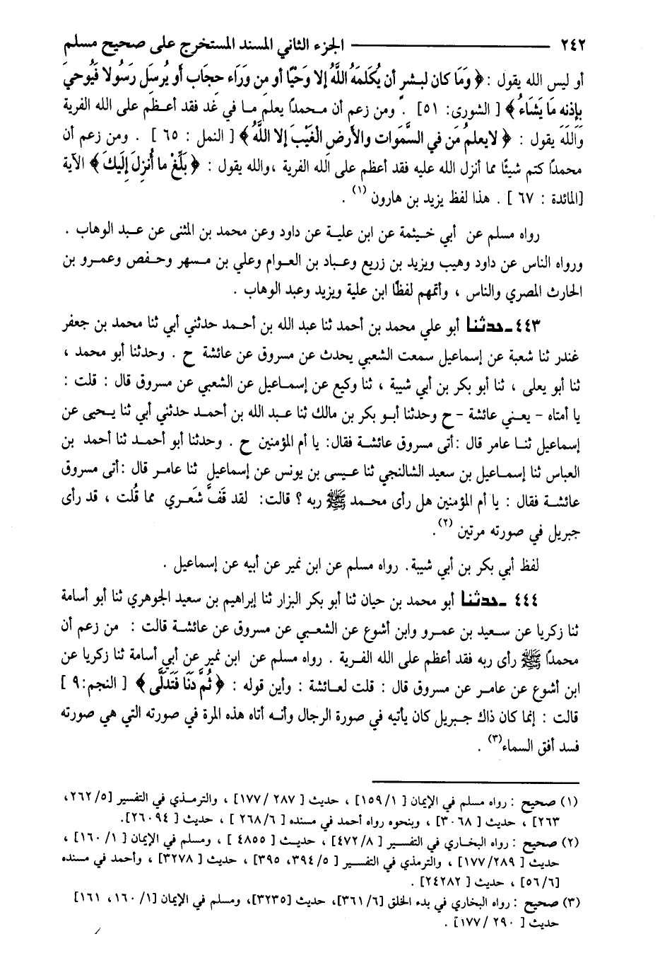 444 - حَدَّثَنَا أَبُو مُحَمَّدِ بْنُ حَيَّانَ ثَنَا أَبُو بَكْرٍ الْبَزَّارُ ثَنَا إِبْرَاهِيمُ بْنُ سَعِيدٍ الْجَوْهَرِيُّ ثَنَا أَبُو أُسَامَةَ ثَنَا زَكَرِيَّا عَنْ سَعِيدِ بْنِ عَمْرٍو وَابْنِ أَشْوَعَ عَنِ الشَّعْبِيِّ عَنْ مَسْرُوقٍ عَنْ عَائِشَةَ قَالَتْ مَنْ زَعَمَ أَنَّ مُحَمَّدًا صَلَّى اللَّهُ عَلَيْهِ وَسَلَّمَ رَأَى رَبَّهُ فَقَدْ أَعْظَمَ عَلَى اللَّهِ الْفِرْيَةَ رَوَاهُ مُسْلِمٌ عَنِ ابْنِ نُمَيْرٍ عَنْ أَبِي أُسَامَةَ ثَنَا زَكَرِيَّا عَنِ ابْنِ أَشْوَعَ عَنْ عَامِرٍ عَنْ مَسْرُوقٍ قَالَ قُلْتُ لِعَائِشَةَ وَأَيْنَ قَوْلُهُ {ثُمَّ دَنَا فَتَدَلَّى} النَّجْم 9 قَالَتْ إِنَّمَا كَانَ ذَاكَ جِبْرِيلُ كَانَ يَأْتِيهِ فِي صُورَةِ الرِّجَالِ وَأَنَّهُ أَتَاهُ هَذِهِ الْمَرَّةَ فِي صُورَتِهِ الَّتِي هِيَ صُورَتُهُ فَسَدَّ أُفُقَ السَّمَاءِ صَحِيح