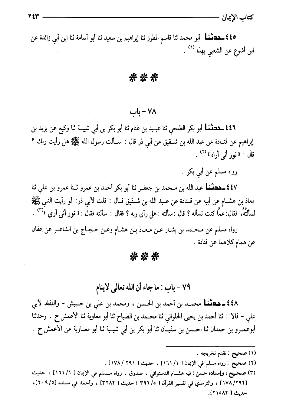 446 - حَدَّثَنَا أَبُو بَكْرٍ الطَّلْحِيُّ ثَنَا عُبَيْدُ بْنُ غَنَّامٍ ثَنَا أَبُو بَكْرِ بْنُ أَبِي شَيْبَةَ ثَنَا وَكِيعٌ عَنْ يَزِيدَ بْنِ إِبْرَاهِيمَ عَنْ قَتَادَةَ عَنْ عَبْدِ اللَّهِ بْنِ شَقِيقٍ عَنْ أَبِي ذَرٍّ قَالَ سَأَلْتُ رَسُولَ اللَّهِ صَلَّى اللَّهُ عَلَيْهِ وَسَلَّمَ هَلْ رَأَيْتَ رَبَّكَ قَالَ (نور أَنِّي أرَاهُ) صَحِيحٌ