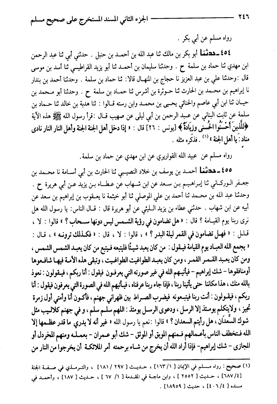 454 - حَدَّثَنَا أَبُو بَكْرِ بْنُ مَالِكٍ ثَنَا عَبْدُ اللَّهِ بْنُ أَحْمَدَ بْنِ حَنْبَلٍ حَدَّثَنِي أَبِي ثَنَا عبد الرَّحْمَن ابْن مَهْدِيٍّ ثَنَا حَمَّادُ بْنُ سَلَمَةَ ح وَحَدَّثَنَا سُلَيْمَانُ بْنُ أَحْمَدَ ثَنَا أَبُو يَزِيدَ الْقَرَاطِيسِيُّ ثَنَا أَسَدُ بْنُ مُوسَى قَالَ وَحَدَّثَنَا عَلِيُّ بْنُ عَبْدِ الْعَزِيزِ نَا حَجَّاجُ بْنُ الْمِنْهَالِ قَالا ثَنَا حَمَّادُ بْنُ سَلَمَةَ وَحَدَّثَنَا أَحْمَدُ بْنُ بُنْدَارٍ نَا إِبْرَاهِيمُ بْنُ مُحَمَّدِ بْنِ الْحَارِثِ ثَنَا حَوْثَرَةُ بْنُ أَشْرَسَ ثَنَا حَمَّادُ بْنُ سَلَمَةَ ح وَحَدَّثَنَا أَبُو مُحَمَّدِ بْنُ حَيَّانَ ثَنَا ابْنُ أَبِي عَاصِمٍ وَالْحِنَّائِيُّ يَحْيَى بْنُ مُحَمَّدٍ وَابْنُ رُسْتَهْ قَالُوا ثَنَا هُدْبَةُ بْنُ خَالِدٍ ثَنَا حَمَّادُ بْنُ سَلَمَةَ عَنْ ثَابِتٍ الْبُنَانِيِّ عَنْ عَبْدِ الرَّحْمَنِ بْنِ أَبِي لَيْلَى عَنْ صُهَيْبٍ قَالَ قَرَأَ رَسُولُ اللَّهِ صَلَّى اللَّهُ عَلَيْهِ وَسَلَّمَ هَذِهِ الآيَةَ {لِلَّذِينَ أَحْسَنُوا الْحُسْنَى وَزِيَادَة} يُونُس 26 قَالَ (إِذَا دَخَلَ أَهْلُ الْجَنَّةِ الْجَنَّةَ وَأَهْلُ النَّارِ النَّارَ نَادَى مُنَادٍ يَا أَهْلَ الْجَنَّةِ) فَذكر مثله صَحِيح