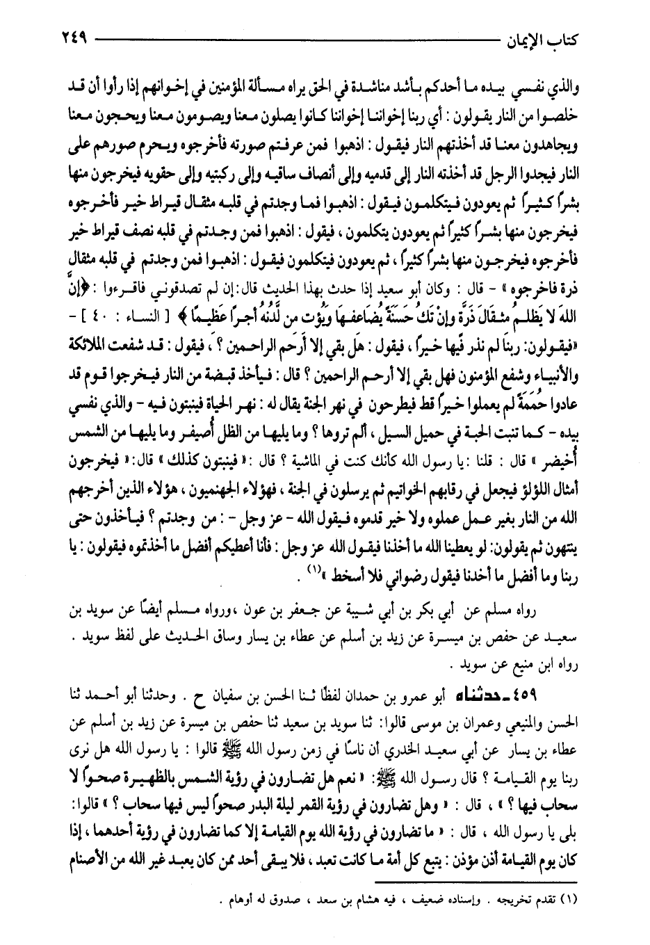 وَالَّذِي نَفْسِي بِيَدِهِ مَا أَحَدُكُمْ بِأَشَدِّ مُنَاشَدَةً فِي الْحَقِّ يَرَاهُ مَسْأَلَةَ الْمُؤْمِنِينَ فِي إِخْوَانِهِمْ وَإِذَا رَأَوْا أَنْ قَدْ خَلَصُوا مِنَ النَّار يَقُولُونَ أَي رَبنَا إجواننا إِخْوَاننَا كَانُوا يصلونَ مَعنا وَيَصُومُونَ مَعنا ويحجون مَعنا ويجاهدون مَعنا قَدْ أَخَذَتْهُمُ النَّارُ فَيَقُولُ اذْهَبُوا فَمَنْ عَرَفْتُمْ صُورَتَهُ فَأَخْرِجُوهُ وَيُحَرِّمُ صُوَرَهُمْ عَلَى النَّارِ فَيَجِدُوا الرَّجُلَ قَدْ أَخَذَتْهُ النَّارُ إِلَى قَدَمَيْهِ وَإِلَى أَنْصَافِ سَاقَيْهِ وَإِلَى رُكْبَتَيْهِ وَإِلَى حِقْوَيْهِ فَيُخْرِجُونَ مِنْهَا بَشَرًا كَثِيرًا ثُمَّ يَعُودُونَ فَيَتَكَلَّمُونَ فَيَقُولُ اذْهَبُوا فَمَا وَجَدْتُمْ فِي قَلْبِهِ مِثْقَالَ قِيرَاطِ خَيْرٍ فَأَخْرِجُوهُ فَيُخْرِجُونَ مِنْهَا بَشَرًا كَثِيرًا ثُمَّ يَعُودُونَ يَتَكَلَّمُونَ فَيَقُولُ اذْهَبُوا فَمَنْ وَجَدْتُمْ فِي قَلْبِهِ نِصْفَ قِيرَاطِ خَيْرٍ فَأَخْرِجُوهُ فَيُخْرِجُونَ مِنْهَا بَشَرًا كَثِيرًا ثُمَّ يَعُودُونَ فَيَتَكَلَّمُونَ فَيَقُولُ اذْهَبُوا فَمَنْ وَجَدْتُمْ فِي قَلْبِهِ مِثْقَالَ ذَرَّةٍ فَأَخْرِجُوهُ) قَالَ وَكَانَ أَبُو سَعِيدٍ إِذَا حَدَّثَ بِهَذَا الْحَدِيثِ قَالَ إِنْ لَمْ تُصَدِّقُونِي فَاقْرَءُوا {إِنَّ اللَّهَ لَا يَظْلِمُ مِثْقَالَ ذَرَّةٍ وَإِنْ تَكُ حَسَنَةً يُضَاعِفْهَا وَيُؤْتِ مِنْ لَدُنْهُ أَجْرًا عَظِيمًا} النِّسَاء 40 (فَيَقُولُونَ رَبَّنَا لَمْ نَذَرْ فِيهَا خَيْرًا فَيَقُولُ هَلْ بَقِيَ إِلا أَرْحَمُ الرَّاحِمِينَ فَيَقُولُ قَدْ شَفَعَتِ الْمَلائِكَةُ وَالأَنْبِيَاءُ وَشَفَعَ الْمُؤْمِنُونَ فَهَلْ بَقِيَ إِلا أَرْحَمُ الرَّاحِمِينَ قَالَ فَيَأْخُذُ قَبْضَةً مِنَ النَّارِ فيخرجوا قوم قَدْ عَادُوا حُمَمَةً لَمْ يَعْمَلُوا خَيْرًا قَطُّ فَيُطْرَحُونَ فِي نَهْرِ الْجَنَّةِ يُقَالُ لَهُ نَهْرُ الْحَيَاةِ فَيَنْبُتُونَ فِيهِ وَالَّذِي نَفْسِي بِيَدِهِ كَمَا تَنْبُتُ الْحَبَّةُ فِي حَمِيلِ السَّيْلِ أَلَمْ تَرَوْهَا وَمَا يَلِيهَا مِنَ الظِّلِّ أُصَيْفرٌ وَمَا يَلِيهَا مِنَ الشَّمْسِ أُخَيْضِرٌ) قَالَ قُلْنَا يَا رَسُولَ اللَّهِ كَأَنَّكَ كُنْتَ فِي الْمَاشِيَةِ قَالَ (فَيَنْبُتُونَ كَذَلِكَ) قَالَ (فَيُخْرِجُونَ أَمْثَالَ اللُّؤْلُؤِ فَيَجْعَلَ فِي رِقَابِهِمُ الْخَوَاتِيمَ ثُمَّ يُرْسَلُونَ فِي الْجَنَّةِ فَهَؤُلاءِ الْجَهَنَّمِيُّونَ هَؤُلاءِ الَّذِينَ أَخْرَجَهُمُ اللَّهُ مِنَ النَّارِ بِغَيْرِ عَمَلٍ عَمِلُوهُ وَلا خَيْرٍ قَدَّمُوهُ فَيَقُولُ اللَّهُ عَزَّ وَجَلَّ مَنْ وَجَدْتُمْ فَيَأْخُذُونَ حَتَّى يَنْتَهَوْنَ ثُمَّ يَقُولُونَ لَوْ يُعْطِينَا اللَّهُ مَا أَخَذْنَا فَيَقُولُ اللَّهُ عَزَّ وَجَلَّ فَأَنَا أُعْطِيكُمْ أَفْضَلَ مَا أَخَذْتُمُوهُ فَيَقُولُونَ يَا رَبَّنَا وَمَا أَفْضَلُ مَا أَخْذَنا فَيَقُولُ رِضْوَانِي فَلا أَسْخَطُ)