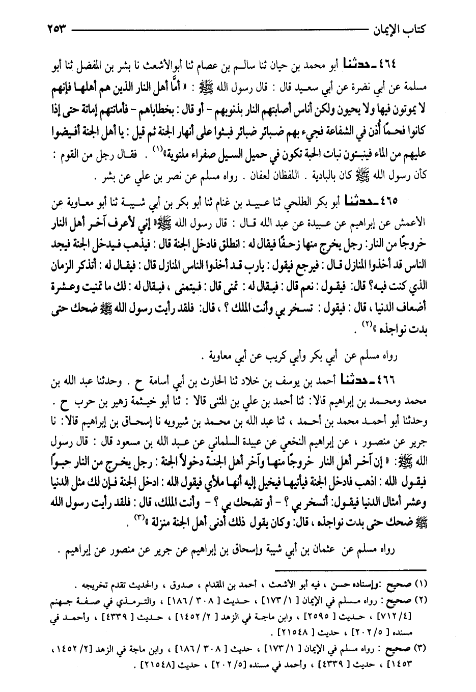 466 - حَدَّثَنَا أَحْمَدُ بْنُ يُوسُفَ بْنُ خَلادٍ ثَنَا الْحَارِثُ بْنُ أَبِي أُسَامَةَ ح وَحَدَّثَنَا عَبْدُ اللَّهِ بْنُ مُحَمَّدٍ وَمُحَمَّدُ بْنُ إِبْرَاهِيمَ قَالا نَا أَحْمَدُ بْنُ عَلِيِّ بْنِ الْمُثَنَّى قَالا ثَنَا أَبُو خَيْثَمَةَ زُهَيْرُ بْنُ حَرْبٍ ح وَحَدَّثَنَا أَبُو أَحْمَدَ مُحَمَّدُ بْنُ أَحْمَدَ ثَنَا عَبْدُ اللَّهِ بْنُ مُحَمَّدِ بْنِ شِيرَوَيْهِ نَا إِسْحَاقُ بْنُ إِبْرَاهِيمَ قَالا نَا جَرِيرٌ عَنْ مَنْصُورٍ عَنْ إِبْرَاهِيمَ النَّخَعِيِّ عَنْ عُبَيْدَةَ السَّلْمَانِيِّ عَنْ عَبْدِ اللَّهِ بْنِ مَسْعُودٍ قَالَ قَالَ رَسُولُ اللَّهِ صَلَّى اللَّهُ عَلَيْهِ وَسَلَّمَ (إِنَّ آخِرَ أَهْلِ النَّارِ خُرُوجًا مِنْهَا وَآخِرَ أَهْلِ الْجَنَّةِ دُخُولا الْجَنَّةَ رَجُلٌ يَخْرُجُ مِنَ النَّارِ حَبْوًا فَيَقُولُ اللَّهُ اذْهَبْ فَادْخُلِ الْجَنَّةَ فَيَأْتِيهَا فَيُخَيَّلُ إِلَيْهِ أَنَّهَا مَلأَى فَيَقُولُ اللَّهُ ادْخُلِ الْجَنَّةَ فَإِنَّ لَكَ مِثْلَ الدُّنْيَا وَعَشْرَ أَمْثَالِ الدُّنْيَا فَيَقُولُ أَتَسْخَرُ بِي أَوْ تَضْحَكُ بِي وَأَنْتَ الْمَلِكُ قَالَ فَلَقَدْ رَأَيْتُ رَسُولُ اللَّهِ صَلَّى اللَّهُ عَلَيْهِ وَسَلَّمَ ضَحِكَ حَتَّى بَدَتْ نَوَاجِذُهُ قَالَ وَكَانَ يَقُولُ ذَلِكَ أَدْنَى أهل الْجنَّة منزلَة) صَحِيح