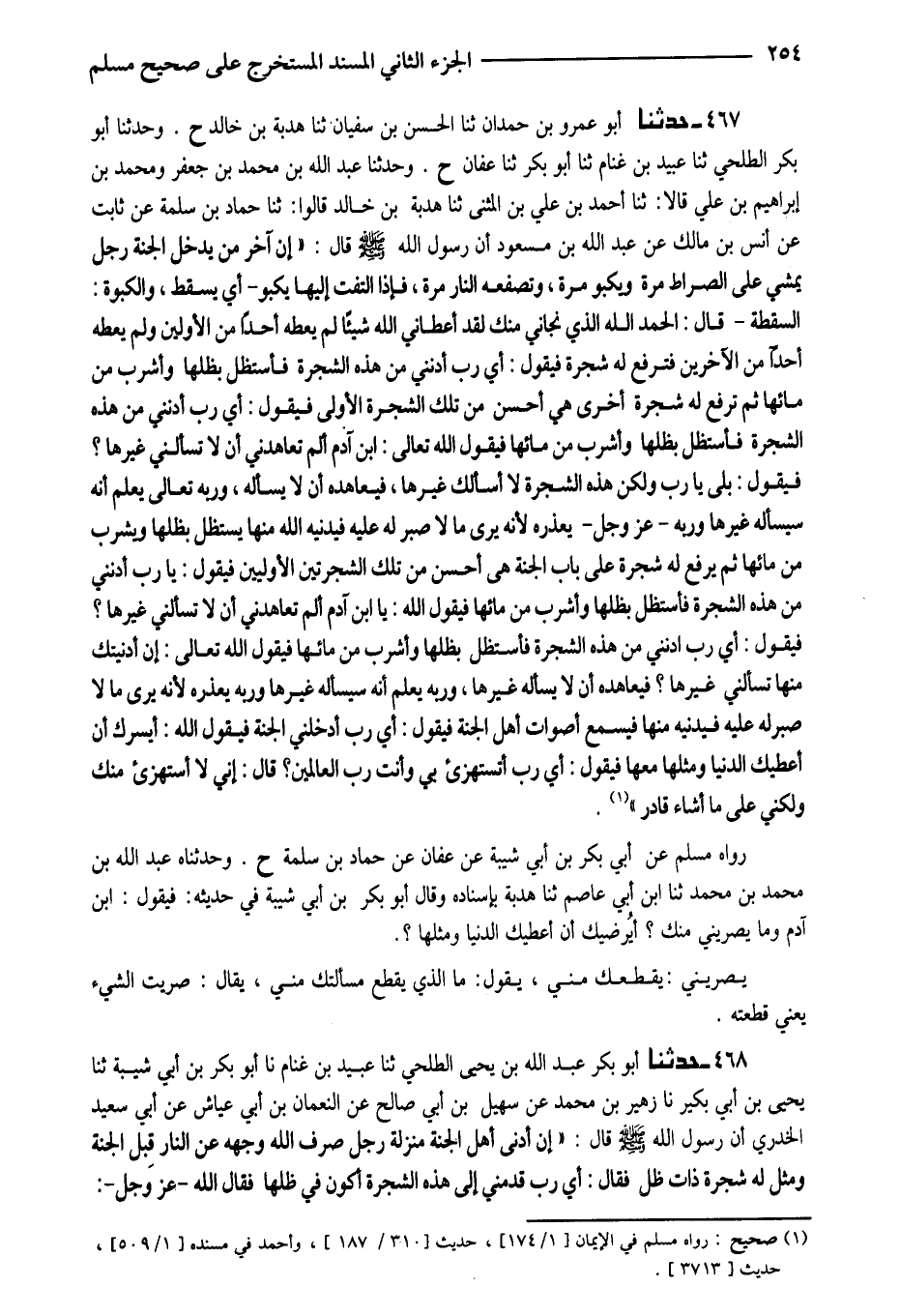 467 - حَدَّثَنَا أَبُو عَمْرِو بْنُ حَمْدَانَ ثَنَا الْحَسَنُ بْنُ سُفْيَانَ ثَنَا هُدْبَةُ بْنُ خَالِدٍ ح وَحَدَّثَنَا أَبُو بَكْرٍ الطَّلْحِيُّ ثَنَا عُبَيْدُ بْنُ غَنَّامٍ نَا أَبُو بَكْرٍ ثَنَا عَفَّانُ ح وَحَدَّثَنَا عَبْدُ اللَّهِ بْنُ مُحَمَّدِ بْنِ جَعْفَرٍ وَمُحَمَّدُ بْنُ إِبْرَاهِيمَ بْنِ عَلِيٍّ قَالا ثَنَا أَحْمَدُ بْنُ عَلِيٍّ بْنِ الْمُثَنَّى ثَنَا هُدْبَةُ بْنُ خَالِدٍ قَالُوا ثَنَا حَمَّادُ بْنُ سَلَمَةَ عَنْ ثَابِتٍ عَنْ أَنَسٍ بْنِ مَالِكٍ عَنْ عَبْدِ اللَّهِ بْنِ مَسْعُودٍ أَنَّ رَسُولَ اللَّهِ صَلَّى اللَّهُ عَلَيْهِ وَسَلَّمَ قَالَ (إِنَّ آخِرَ مَنْ يَدْخُلُ الْجَنَّةَ رَجُلٌ يَمْشِي عَلَى الصِّرَاطِ مَرَّةً وَيَكْبُو مَرَّةً وَتَصْفَعُهُ النَّارُ مَرَّةً فَإِذَا الْتَفَتَ إِلَيْهَا يَكْبُو أَيْ يسْقط والكبوة السقطة قَالَ الحمدلله الَّذِي نَجَّانِي مِنْكَ لَقَدْ أَعْطَانِي اللَّهُ شَيْئًا لَمْ يُعْطِهِ أَحَدًا مِنَ الأَوَّلِينَ وَلَمْ يُعْطِهِ أَحَدًا مِنَ الآخِرِينَ فَتُرْفَعُ لَهُ شَجَرَةٌ فَيَقُولُ أَيَّ رَبِّ أَدْنِنِي مِنْ هَذِهِ الشَّجَرَةِ فَأَسْتَظِلُّ بِظِلِّهَا وَأَشْرَبُ مِنْ مَائِهَا ثُمَّ تُرْفَعُ لَهُ شَجَرَةٌ أُخْرَى هِيَ أَحْسَنُ مِنْ تِلْكَ الشَّجَرَةِ الْأُولَى فَيَقُولُ أَيَّ رَبِّ أَدْنِنِي مِنْ هَذِهِ الشَّجَرَةِ فَأَسْتَظِلُّ بِظِلِّهَا وَأَشْرَبُ مِنْ مَائِهَا فَيَقُولُ اللَّهُ تَعَالَى ابْنَ آدَمَ أَلَمْ تُعَاهِدْنِي أَنْ لَا تَسْأَلْنِي غَيْرَهَا فَيَقُولُ بَلَى يَا رَبِّ وَلَكِنَّ هَذِهِ الشَّجَرَةُ لَا أَسْأَلُكَ غَيْرَهَا فَيُعَاهِدُهُ أَنْ لَا يَسْأَلَهُ وَرَبُّهُ تَعَالَى يَعْلَمُ أَنَّهُ سَيَسْأَلُهُ غَيرهَا وَوجه عَزَّ وَجَلَّ يَعْذِرُهُ لأَنَّهُ يَرَى مَا لَا صَبْرَ لَهُ عَلَيْهِ فَيُدْنِيهِ اللَّهُ مِنْهَا يَسْتَظِلُّ بِظِلِّهَا وَيَشْرَبُ مِنْ مَائِهَا ثُمَّ يَرْفَعُ لَهُ شَجَرَةً عَلَى بَابِ الْجَنَّةِ هِيَ أَحْسَنُ مِنْ تِلْكَ الشَّجَرَتَيْنِ الْأُولَيَيْنِ فَيَقُولُ يَا رَبِّ أَدْنِنِي مِنْ هَذِهِ الشَّجَرَةِ فَأَسْتَظِلُّ بِظِلِّهَا وَأَشْرَبُ مِنْ مَائِهَا فَيَقُولُ اللَّهُ يَا ابْنَ آدَمَ أَلَمْ تُعَاهِدْنِي أَنْ لَا تَسْأَلْنِي غَيْرَهَا فَيَقُولُ أَيَّ رَبِّ أَدْنِنِي مِنْ هَذِهِ الشَّجَرَةِ فَأَسْتَظِلُّ بِظِلِّهَا وَأَشْرَبُ مِنْ مَائِهَا فَيَقُولُ اللَّهُ تَعَالَى إِنْ أَدْنَيْتُكَ مِنْهَا تَسْأَلُنِي غَيْرَهَا فَيُعَاهِدُهُ أَنْ لَا يَسْأَلَهُ غَيْرَهَا وَرَبُّهُ يَعْلَمُ أَنَّهُ سَيَسْأَلُهُ غَيْرَهَا وَرَبُّهُ يَعْذِرُهُ لأَنَّهُ يَرَى مَا لَا صَبْرَ لَهُ عَلَيْهِ فَيُدْنِيهِ مِنْهَا فَيَسْمَعُ أَصْوَاتَ أَهْلِ الْجَنَّةِ فَيَقُولُ أَيَّ رَبِّ أَدْخِلْنِي الْجَنَّةَ فَيَقُولُ اللَّهُ أَيَسُرُّكَ أَنْ أُعْطِيكَ الدُّنْيَا وَمِثْلَهَا مَعَهَا فَيَقُولُ أَيَّ رَبِّ أتستهزىء بِي وَأَنْتَ رَبُّ الْعَالَمِينَ قَالَ إِنِّي لَا أستهزىء مِنْكَ وَلَكِنِّي عَلَى مَا أَشَاءُ قَادر) صَحِيحٌ