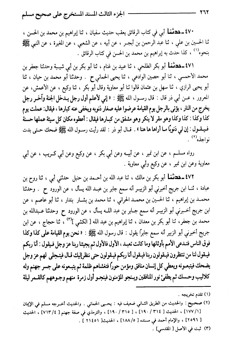471 - حَدَّثَنَا أَبُو بَكْرٍ الطَّلْحِيُّ ثَنَا عُبَيْدُ بْنُ غَنَّامٍ ثَنَا أَبُو بَكْرِ بْنُ أَبِي شَيْبَةَ وَحَدَّثَنَا جَعْفَرُ بْنُ مُحَمَّدٍ الأَحْمَسِيُّ ثَنَا أَبُو حُصَيْنٍ الْوَادِعِيُّ ثَنَا يَحْيَى الْحِمَّانِيُّ ح وَحَدَّثَنَا أَبُو مُحَمَّدِ بْنُ حَيَّانَ ثَنَا أَبُو يَحْيَى الرَّازِيُّ ثَنَا سَهْلُ بْنُ عُثْمَانَ قَالُوا ثَنَا أَبُو مُعَاوِيَةَ وَقَالَ أَبُو بَكْرٍ ثَنَا وَكِيعٌ عَنِ الأَعْمَشِ عَنِ الْمَعْرُورِ عَنْ أَبِي ذَرٍّ قَالَ: قَالَ رَسُولُ اللَّهِ صَلَّى اللَّهُ عَلَيْهِ وَسَلَّمَ: (إِنِّي لأَعْلَمُ أَوَّلَ رَجُلٍ يَدْخُلُ الْجَنَّةَ وَآخِرَ رَجُلٍ يَخْرُجُ مِنَ النَّارِ يُؤْتَى بِالرَّجُلِ يَوْمَ الْقِيَامَةِ عَرَضُوا عَلَيْهِ صِغَارَ ذُنُوبِهِ وَيُخْفَى عَنْهُ كِبَارُهَا فَيُقَالُ: عَمِلْتَ يَوْم كَذَا وَكَذَا: كَذَا وكَذَا وَهُوَ مُقِرٌّ لَا يُنْكِرُ وَهُوَ مُشْفِقٌ مِنْ كِبَارِهَا فَيُقَالُ: أَعْطُوهُ مَكَانَ كُلِّ سَيِّئَةٍ عَمِلَهَا حَسَنَةً فَيَقُولُ: إِنَّ لِي ذَنُوبًا مَا أَرَاهَا هَا هُنَا) قَالَ أَبُو ذَرٍّ: لَقَدْ رَأَيْتُ رَسُولَ اللَّهِ صَلَّى اللَّهُ عَلَيْهِ وَسَلَّمَ ضَحِكَ حَتَّى بَدَتْ نَوَاجِذُهُ صَحِيحٌ رَوَاهُ مُسْلِمٌ عَنِ ابْنِ نُمَيْرٍ عَنْ أَبِيهِ وَعَنْ أَبِي بَكْرٍ عَنْ وَكِيعٍ وَعَنْ أَبِي كُرَيْبٍ عَنْ أَبِي مُعَاوِيَةَ وَعَنِ ابْنِ نُمَيْرٍ عَنْ وَكِيعٍ وَأَبِي مُعَاوِيَةَ.