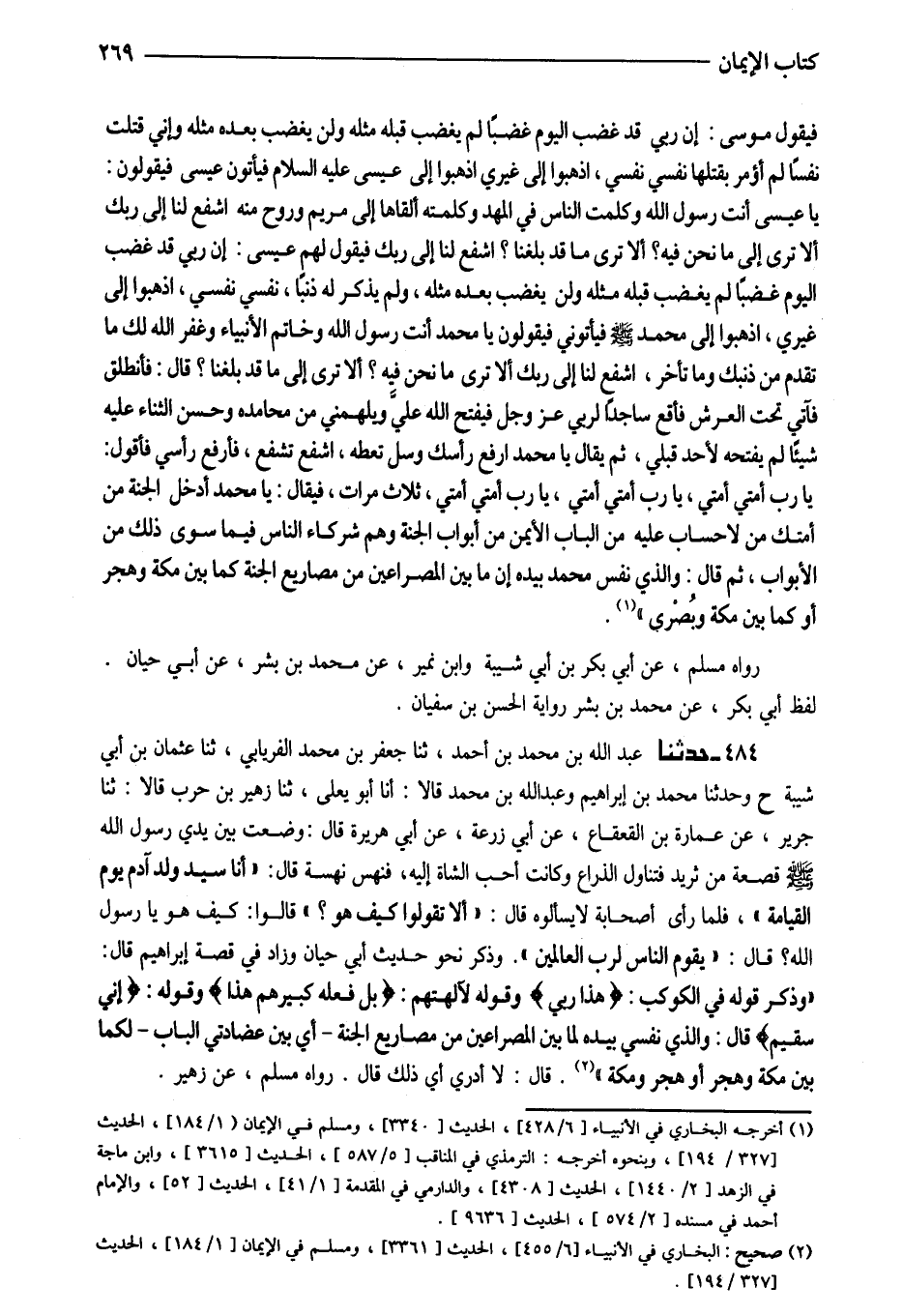 فَيَقُولُ مُوسَى إِنَّ رَبِّي قَدْ غَضِبَ الْيَوْمَ غَضَبًا لَمْ يَغْضَبْ قَبْلَهُ مِثْلَهُ وَلَنْ يَغْضَبَ بَعْدَهُ مِثْلَهُ وَإِنِّي قَتَلْتُ نَفْسًا لَمْ أُؤْمَرْ بِقَتْلِهَا نَفْسِي نَفْسِي اذْهَبُوا إِلَى غَيْرِي اذْهَبُوا إِلَى عِيسَى عَلَيْهِ السَّلامُ فَيَأْتُونَ عِيسَى فَيَقُولُونَ يَا عِيسَى أَنْتَ رَسُولُ اللَّهِ وَكَلَّمْتَ النَّاسَ فِي الْمَهْدِ وَكَلِمَتُهُ أَلْقَاهَا إِلَى مَرْيَمَ وَرَوْحٌ مِنْهُ اشْفَعْ لَنَا إِلَى رَبِّكَ أَلا تَرَى إِلَى مَا نَحْنُ فِيهِ أَلا تَرَى مَا قَدْ بَلَغَنَا اشْفَعْ لَنَا إِلَى رَبِّكَ فَيَقُولُ لَهُمْ عِيسَى إِنَّ رَبِّي قَدْ غَضِبَ الْيَوْمَ غَضَبًا لَمْ يَغْضَبْ قَبْلَهُ مِثْلَهُ وَلَنْ يَغْضَبَ بَعْدَهُ مِثْلَهُ وَلَمْ يَذْكُرْ لَهُ ذَنْبًا نَفْسِي نَفْسِي اذْهَبُوا إِلَى غَيْرِي اذْهَبُوا إِلَى مُحَمَّدٍ صَلَّى اللَّهُ عَلَيْهِ وَسَلَّمَ فَيَأْتُونِي فَيَقُولُونَ يَا مُحَمَّدُ أَنْتَ رَسُولُ اللَّهِ وَخَاتَمُ الأَنْبِيَاءِ وَغَفَرَ اللَّهُ لَكَ مَا تَقَدَّمَ مِنْ ذَنْبِكَ وَمَا تَأَخَّرَ اشْفَعْ لَنَا إِلَى رَبِّكَ أَلا تَرَى مَا نَحْنُ فِيهِ أَلا تَرَى إِلَى مَا قَدْ بَلَغَنَا قَالَ فَأَنْطَلِقُ فَآتِي تَحْتَ الْعَرْشِ فَأَقَعُ سَاجِدًا لِرَبِّي عَزَّ وَجَلَّ فَيَفْتَحُ اللَّهُ عَلَيَّ وَيُلْهِمُنِي مِنْ مَحَامِدِهِ وَحُسْنِ الثَّنَاءِ عَلَيْهِ شَيْئًا لَمْ يَفْتَحْهُ لأَحَدٍ قَبْلِي ثُمَّ يُقَالُ يَا مُحَمَّدُ ارْفَعْ رَأْسَكَ وَسَلْ تُعْطَهُ اشْفَعْ تُشَفَّعْ فَأَرْفَعُ رَأْسِي فَأَقُولُ يَا رَبِّ أُمَّتِي أُمَّتِي يَا رَبِّ أُمَّتِي أُمَّتِي يَا رَبِّ أُمَّتِي أُمَّتِي ثَلاثَ مَرَّاتٍ فَيُقَالُ يَا مُحَمَّدُ أَدْخِلِ الْجَنَّةَ مِنْ أُمَّتِكَ مَنْ لَا حِسَابَ عَلَيْهِ مِنَ الْبَابِ الأَيْمَنِ مِنْ أَبْوَابِ الْجَنَّةِ وَهُمْ شُرَكَاءُ النَّاسِ فِيمَا سِوَى ذَلِكَ مِنَ الأَبْوَابِ ثُمَّ قَالَ وَالَّذِي نَفْسُ مُحَمَّدٍ بِيَدِهِ إِنَّ مَا بَيْنَ الْمِصْرَاعَيْنِ مِنْ مَصَارِيعِ الْجَنَّةِ كَمَا بَيْنَ مَكَّةَ وَهَجَرٍ أَوْ كَمَا بَيْنَ مَكَّةَ وَبُصْرَى)