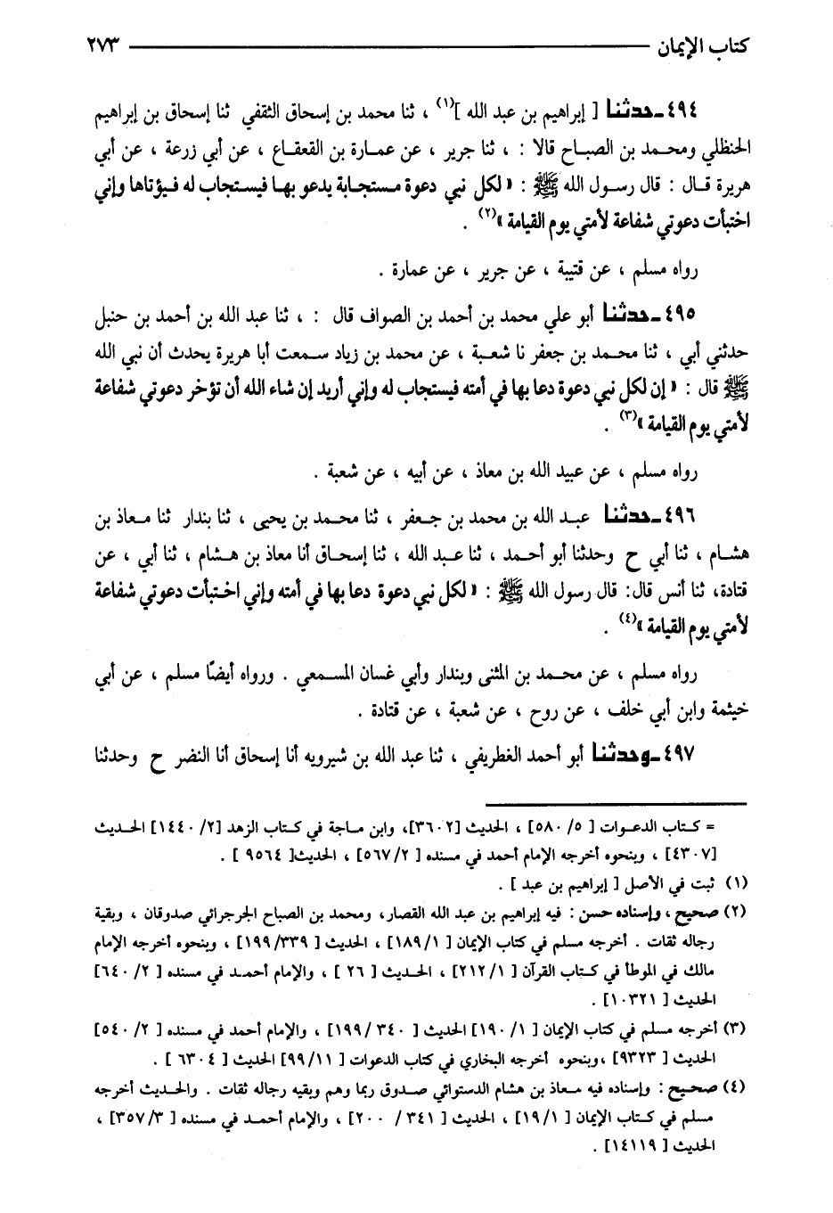 494 - حَدَّثَنَا إِبْرَاهِيمُ بْنُ عَبْدِ اللَّهِ ثَنَا مُحَمَّدُ بْنُ إِسْحَاقَ الثَّقَفِيُّ ثَنَا إِسْحَاقُ بْنُ إِبْرَاهِيمَ الْحَنْظَلِيُّ وَمُحَمّد بن الصَّباح قَالا ثَنَا جَرِيرٌ عَنْ عُمَارَةَ بْنِ الْقَعْقَاعِ عَنْ أَبِي زُرْعَةَ عَنْ أَبِي هُرَيْرَةَ قَالَ قَالَ رَسُولُ اللَّهِ صَلَّى اللَّهُ عَلَيْهِ وَسَلَّمَ (لِكُلِّ نَبِيٍّ دَعْوَةٌ مُسْتَجَابَةٌ يَدْعُو بِهَا فَيُسْتَجَابُ لَهُ فَيُؤْتَاهَا وَإِنِّي أَخْتَبَأْتُ دَعْوَتِي شَفَاعَةً لِأُمَّتِي يَوْم الْقِيَامَة) صَحِيح وَإِسْنَادُهُ حَسَنٌ رَوَاهُ مُسْلِمٌ عَنْ قُتَيْبَةَ عَنْ جَرِيرٍ عَنْ عُمَارَةَ
