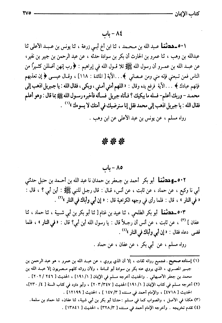 501 - حَدَّثَنَا عَبْدُ اللَّهِ بْنُ مُحَمَّدٍ ثَنَا ابْنُ أَخِ أَبِي زُرْعَةَ ثَنَا يُونُسُ بْنُ عَبْدِ الأَعْلَى ثَنَا عَبْدُ اللَّهِ بْنُ وَهْبٍ ثَنَا عَمْرُو بْنُ الْحَارِثِ أَنَّ بَكْرَ بْنَ سَوَادَةَ حَدَّثَهُ عَنْ عَبْدِ الرَّحْمَنِ بْنِ جُبَيْرِ بْنِ نُفَيْرٍ عَنْ عَبْدِ اللَّهِ بْنِ عَمْرٍو أَنَّ رَسُولَ اللَّهِ صَلَّى اللَّهُ عَلَيْهِ وَسَلَّمَ تَلا قَوْلَ اللَّهِ فِي إِبْرَاهِيمَ {رَبِّ إِنَّهُنَّ أَضْلَلْنَ كَثِيرًا مِنَ النَّاسِ فَمَنْ تَبِعَنِي فَإِنَّهُ مِنِّي وَمَنْ عَصَانِي} الْآيَة الْمَائِدَة 118 وَقَالَ عِيسَى {إِنْ تُعَذِّبْهُمْ فَإِنَّهُمْ عِبَادك} الآيَةَ فَرَفَعَ يَدَهُ وَقَالَ (اللَّهُمَّ أُمَّتِي أُمَّتِي وَبَكَى فَقَالَ اللَّهُ يَا جِبْرِيلُ اذْهَبْ إِلَى مُحَمَّدٍ وَرَبُّكَ أَعْلَمُ فَسَلْهُ مَا يُبْكِيكَ فَأَتَاهُ جِبْرِيلُ فَسَأَلَهُ فَأَخْبَرَهُ رَسُولُ اللَّهِ صَلَّى اللَّهُ عَلَيْهِ وَسَلَّمَ بِمَا قَالَ وَهُوَ أَعْلَمُ فَقَالَ اللَّهُ يَا جِبْرِيلُ اذْهَبْ إِلَى مُحَمَّد فَقل إِن سَنُرْضِيكَ فِي أُمَّتِكَ لَا يَسُوءُكَ) إِسْنَاده صَحِيح