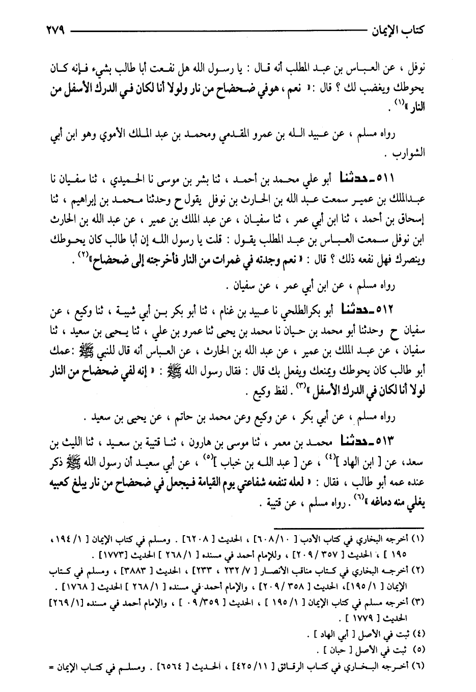 511 - حَدَّثَنَا أَبُو عَلِيٍّ مُحَمَّدُ بْنُ أَحْمَدَ ثَنَا بِشْرُ بْنُ مُوسَى نَا الْحُمَيْدِيُّ ثَنَا سُفْيَانُ نَا عَبْدُ الْمَلِكِ بْنُ عُمَيْرٍ سَمِعْتُ عَبْدَ اللَّهِ بْنَ الْحَارِثِ بْنِ نَوْفَلٍ يَقُولُ ح وَحَدَّثَنَا مُحَمَّدُ بْنُ إِبْرَاهِيمَ ثَنَا إِسْحَاقُ بْنُ أَحْمَدَ ثَنَا ابْنُ أَبِي عُمَرَ ثَنَا سُفْيَانُ عَنْ عَبْدِ الْمَلِكِ بْنِ عُمَيْرٍ عَنْ عَبْدِ اللَّهِ بْنِ الْحَارِثِ ابْن نَوْفَلٍ سَمِعْتُ الْعَبَّاسَ بْنَ عَبْدِ الْمُطَّلِبِ يَقُولُ قُلْتُ يَا رَسُولَ اللَّهِ إِنَّ أَبَا طَالِبٍ كَانَ يَحُوطُكَ وَيَنْصُرُكَ فَهَلْ نَفَعَهُ ذَلِكَ قَالَ (نَعَمْ وَجَدْتُهُ فِي غَمَرَاتٍ مِنَ النَّارِ فَأَجْرَجْتُهُ إِلَى ضَحْضَاحٍ)
