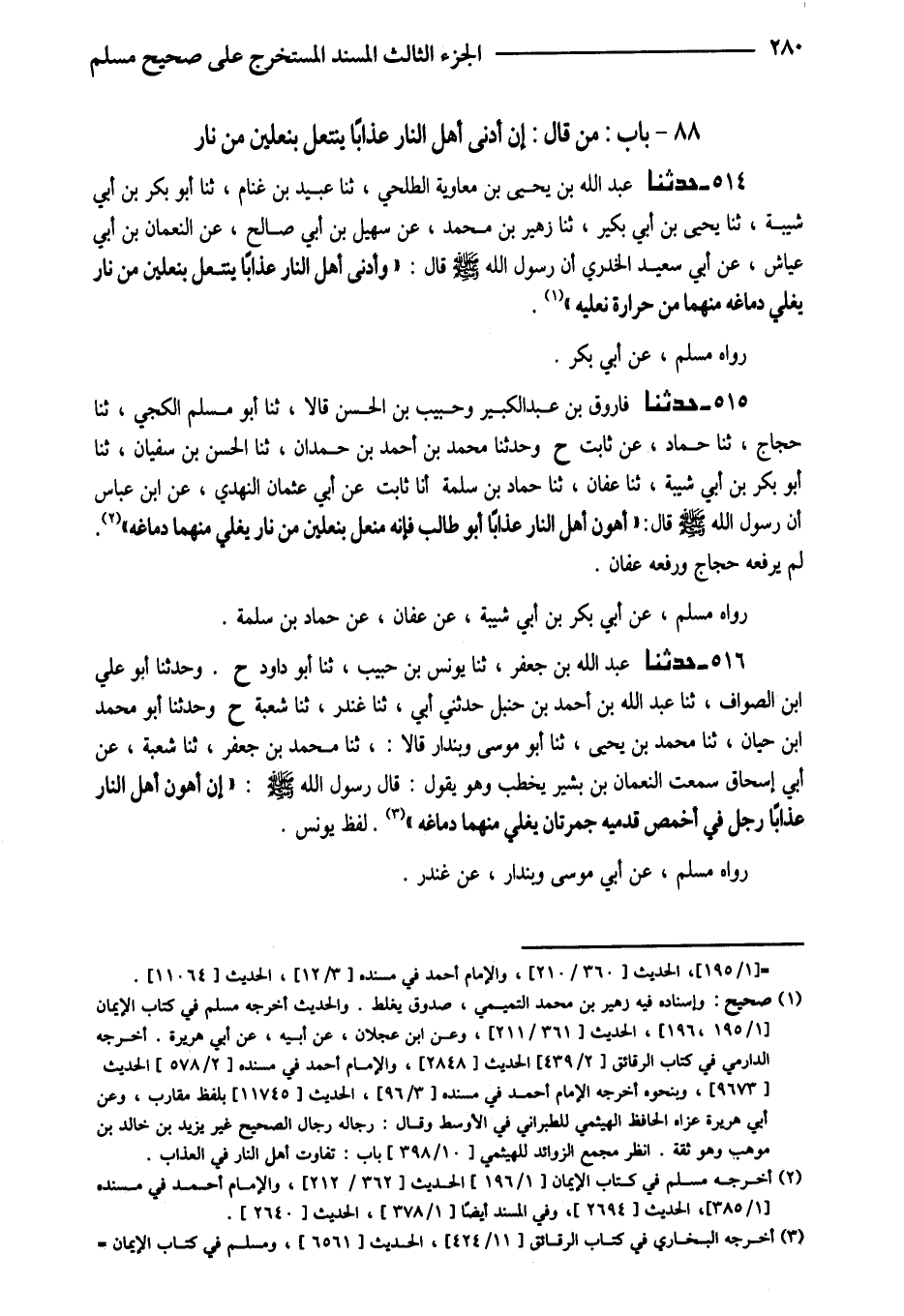 514 - حَدَّثَنَا عَبْدُ اللَّهِ بْنُ يَحْيَى بْنِ مُعَاوِيَةَ الطَّلْحِيُّ ثَنَا عُبَيْدُ بْنُ غَنَّامٍ ثَنَا أَبُو بَكْرِ بْنُ أبي شيبَة ثَنَا يحيى ين أَبِي بُكَيْرٍ ثَنَا زُهَيْرُ بْنُ مُحَمَّدٍ عَنْ سُهَيْلِ بْنِ أَبِي صَالِحٍ عَنِ النُّعْمَانِ بْنِ أَبِي عَيَّاشٍ عَنْ أَبِي سَعِيدٍ الْخُدْرِيِّ إِنَّ رَسُولَ اللَّهِ صَلَّى اللَّهُ عَلَيْهِ وَسَلَّمَ قَالَ (وَأَدْنَى أَهْلِ النَّارِ عَذَابًا يَنْتَعِلُ بِنَعْلَيْنِ مِنْ نَارٍ يَغْلِي دِمَاغُهُ مِنْهُمَا مِنْ حرارة نَعْلَيْه) صَحِيحٌ