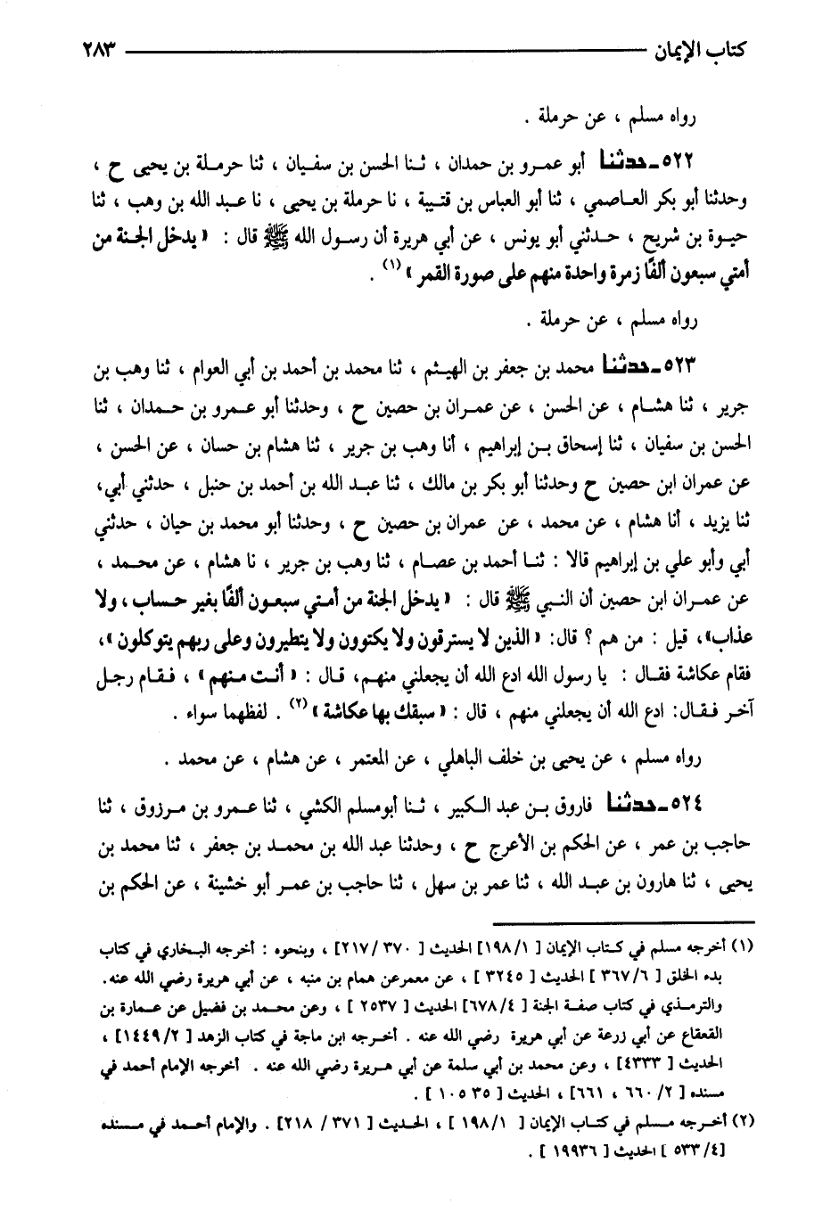 523 - حَدَّثَنَا مُحَمَّدُ بْنُ جَعْفَرِ بْنِ الْهَيْثَمِ ثَنَا مُحَمَّدُ بْنُ أَحْمَدَ بْنِ أَبِي الْعَوَّامِ ثَنَا وَهْبُ بْنُ جَرِيرٍ نَا هِشَامٌ عَنِ الْحَسَنِ عَنْ عِمْرَانَ بْنِ حُصَيْنٍ ح وَحَدَّثَنَا أَبُو عَمْرِو بْنُ حَمْدَانَ ثَنَا الْحَسَنُ بْنُ سُفْيَانَ ثَنَا إِسْحَاقُ بْنُ إِبْرَاهِيمَ أَنَا وَهْبُ بْنُ جَرِيرٍ ثَنَا هِشَامُ بْنُ حَسَّانَ عَنِ الْحَسَنِ عَنْ عمرَان ابْن حُصَيْنٍ ح وَحَدَّثَنَا أَبُو بَكْرِ بْنُ مَالِكٍ ثَنَا عَبْدُ اللَّهِ بْنُ أَحْمَدَ بْنِ حَنْبَلٍ حَدَّثَنِي أَبِي ثَنَا يَزِيدُ أَنَا هِشَامٌ عَنْ مُحَمَّدٍ عَنْ عِمْرَانَ بْنِ حُصَيْنٍ ح وَحَدَّثَنَا أَبُو مُحَمَّدِ بْنُ حَيَّانَ حَدَّثَنِي أَبِي وَأَبُو عَلِيِّ بْنُ إِبْرَاهِيمَ قَالا ثَنَا أَحْمَدُ بْنُ عِصَامٍ ثَنَا وَهْبُ بْنُ جَرِيرٍ ثَنَا هِشَامٌ عَنْ مُحَمَّد عَن عمرَان ابْن حُصَيْنٍ أَنَّ النَّبِيَّ صَلَّى اللَّهُ عَلَيْهِ وَسَلَّمَ قَالَ (يَدْخُلُ الْجَنَّةَ مِنْ أُمَّتِي سَبْعُونَ أَلْفًا بِغَيْرِ حِسَابٍ وَلا عَذَابٍ) قِيلَ مَنْ هُمْ قَالَ (الَّذِينَ لَا يَسْتَرْقُونَ وَلا يَكْتَوُونَ وَلا يَتَطَيَّرُونَ وَعَلَى رَبِّهِمْ يَتَوَكَّلُونَ) فَقَامَ عُكَّاشَةُ فَقَالَ يَا رَسُولَ اللَّهِ ادْعُ اللَّهَ أَنْ يَجْعَلَنِي مِنْهُمْ قَالَ (أَنْتَ مِنْهُمْ) فَقَامَ رَجُلٌ آخَرُ فَقَالَ ادْعُ اللَّهَ أَنْ يَجْعَلَنِي مِنْهُمْ قَالَ (سَبَقَكَ بِهَا عُكَّاشَةُ) لَفْظُهُمَا سَوَاءٌ