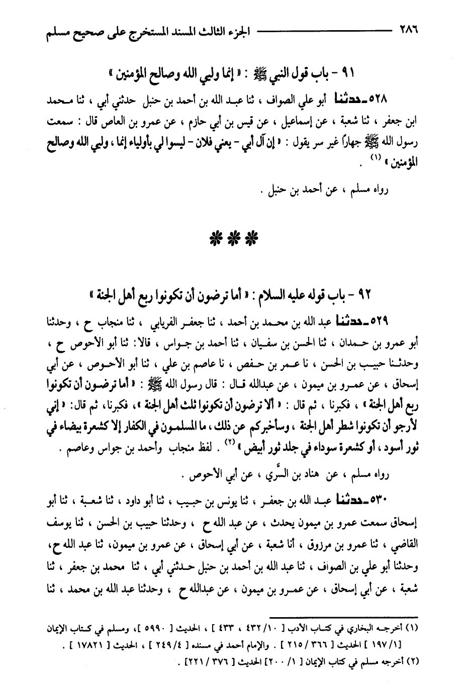 529 - حَدَّثَنَا عَبْدُ اللَّهِ بْنُ مُحَمَّدِ بْنِ أَحْمَدَ ثَنَا جَعْفَرٌ الْفِرْيَابِيُّ ثَنَا مِنْجَابٌ ح وَحَدَّثَنَا أَبُو عَمْرِو بْنُ حَمْدَانَ ثَنَا الْحَسَنُ بْنُ سُفْيَانَ ثَنَا أَحْمَدُ بْنُ جَوَّاسٍ قَالا ثَنَا أَبُو الأَحْوَصِ ح وَحَدَّثَنَا حَبِيبُ بْنُ الْحَسَنِ نَا عُمَرُ بْنُ حَفْصٍ نَا عَاصِمُ بْنُ عَلِيٍّ ثَنَا أَبُو الأَحْوَصِ عَنْ أَبِي إِسْحَاقَ عَنْ عَمْرِو بْنِ مَيْمُونٍ عَنْ عَبْدِ اللَّهِ قَالَ قَالَ رَسُولُ اللَّهِ صَلَّى اللَّهُ عَلَيْهِ وَسَلَّمَ (أَمَا تَرْضَوْنَ أَنْ تَكُونُوا رُبْعَ أَهْلِ الْجَنَّةِ) فَكَبَّرْنَا ثُمَّ قَالَ أَلا تَرْضَوْنَ أَنْ يَكُونُوا ثُلُثَ أَهْلِ الْجَنَّةِ فَكَبَّرْنَا ثُمَّ قَالَ (إِنِّي لأَرْجُو أَنْ تَكُونُوا شَطْرَ أَهْلِ الْجَنَّةِ وَسَأُخْبِرُكُمْ عَنْ ذَلِكَ مَا الْمُسْلِمُونَ فِي الْكُفَّارِ إِلا كَشَعْرَةٍ بَيْضَاءَ فِي ثَوْرٍ أَسْوَدَ أَوْ كَشَعْرَةٍ سَوْدَاءَ فِي جِلْدِ ثَوْرٍ أَبْيَضَ) لَفْظُ مِنْجَابٍ وَأَحْمَدَ بْنِ جَوَّاسٍ وَعَاصِمٍ