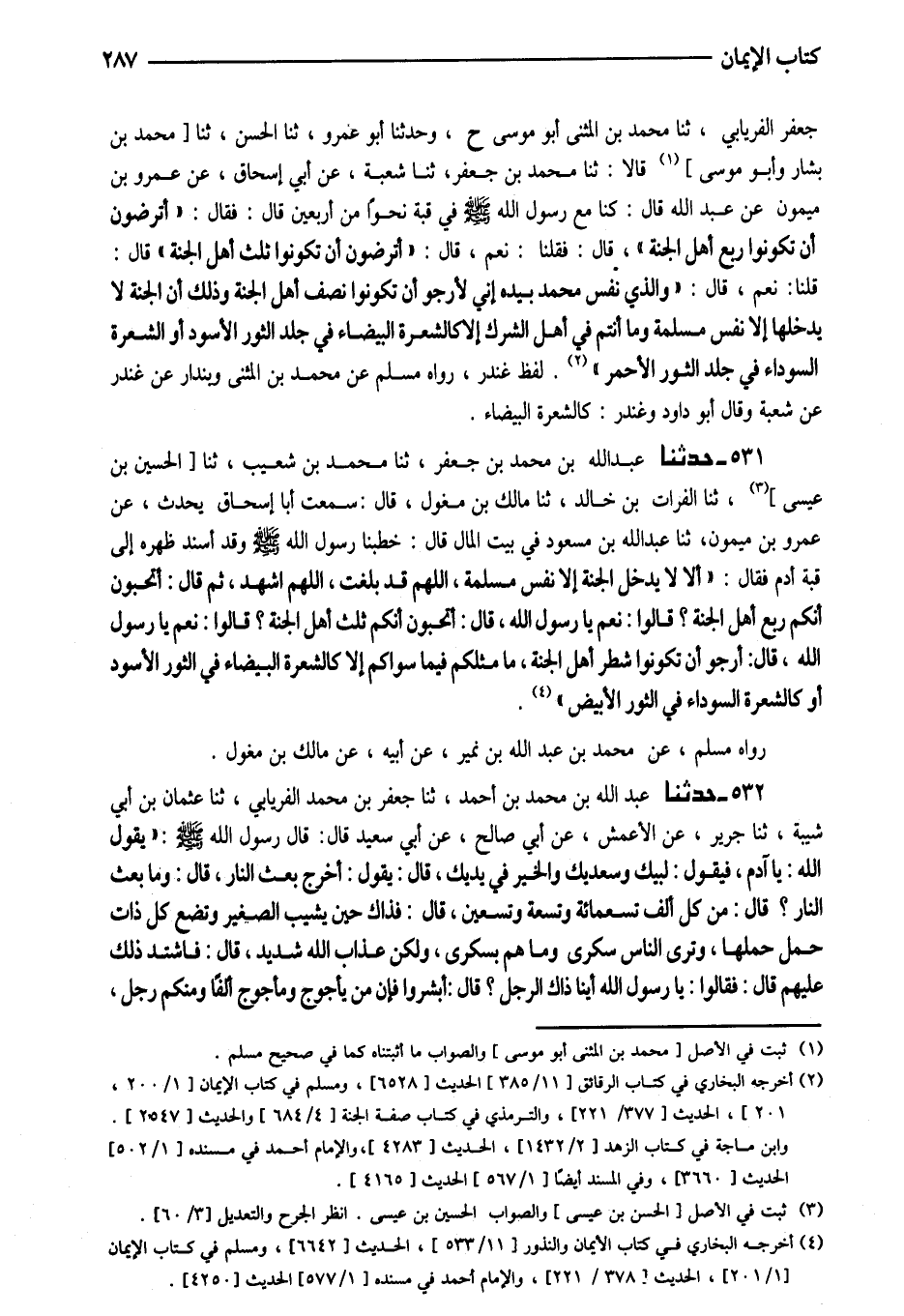 جَعْفَرٌ الْفِرْيَابِيُّ ثَنَا مُحَمَّدُ بْنُ الْمُثَنَّى أَبُو مُوسَى ح وَحَدَّثَنَا أَبُو عَمْرٍو ثَنَا الْحَسَنُ ثَنَا مُحَمَّدُ بْنُ بَشَّارٍ وَأَبُو مُوسَى قَالا ثَنَا مُحَمَّدُ بْنُ جَعْفَرٍ ثَنَا شُعْبَةُ عَنْ أَبِي إِسْحَاقَ عَنْ عَمْرِو بْنِ مَيْمُونٍ عَنْ عَبْدِ اللَّهِ قَالَ كُنَّا مَعَ رَسُولُ اللَّهِ صَلَّى اللَّهُ عَلَيْهِ وَسَلَّمَ فِي قُبَّةٍ نَحْوًا مِنْ أَرْبَعِينَ قَالَ فَقَالَ (أَتَرْضَوْنَ أَنْ تَكُونُوا رُبْعَ أَهْلِ الْجَنَّةِ) قَالَ فَقُلْنَا نَعَمْ قَالَ (أَتَرْضَوْنَ أَنْ تَكُونُوا ثُلُثَ أَهْلِ الْجَنَّةِ) قَالَ قُلْنَا نَعَمْ قَالَ (وَالَّذِي نَفْسُ مُحَمَّدٍ بِيَدِهِ إِنِّي لأَرْجُو أَنْ تَكُونُوا نِصْفَ أَهْلِ الْجَنَّةِ وَذَلِكَ أَنَّ الْجَنَّةَ لَا يَدْخُلُهَا إِلا نَفْسٌ مُسْلِمَةٌ وَمَا أَنْتُمْ فِي أَهْلِ الشِّرْكِ إِلا كَالشَّعْرَةِ الْبَيْضَاءِ فِي جِلْدِ الثَّوْرِ الأَسْوَدِ أَوِ الشَّعْرَةِ السَّوْدَاءِ فِي جِلْدِ الثَّوْرِ الأَحْمَرِ) لَفْظُ غُنْدَرٍ رَوَاهُ مُسْلِمٌ عَنْ مُحَمَّدِ بْنِ الْمُثَنَّى وَبُنْدَارٌ عَنْ غُنْدَرٍ عَنْ شُعْبَةَ وَقَالَ أَبُو دَاوُدَ وَغُنْدَرٌ كَالشَّعْرَةِ الْبَيْضَاءِ