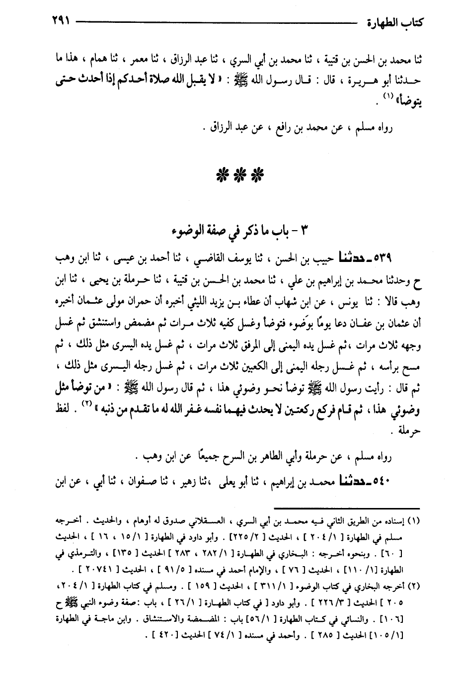 539 - حَدَّثَنَا حَبِيبُ بْنُ الْحَسَنِ ثَنَا يُوسُفُ الْقَاضِي ثَنَا أَحْمَدُ بْنُ عِيسَى ثَنَا ابْنُ وَهْبٍ ح وَحَدَّثَنَا مُحَمَّدُ بْنُ إِبْرَاهِيمَ بْنِ عَلِيٍّ ثَنَا مُحَمَّدُ بْنُ الْحَسَنِ بْنِ قُتَيْبَةَ ثَنَا حَرْمَلَةُ بْنُ يَحْيَى ثَنَا ابْنُ وَهْبٍ قَالا ثَنَا يُونُسُ عَنِ ابْنِ شِهَابٍ أَنَّ عَطَاءَ بْنَ يَزِيدَ اللَّيْثِيَّ أَخْبَرَهُ أَنَّ حُمْرَانَ مَوْلَى عُثْمَانَ أَخْبَرَهُ أَنَّ عُثْمَانَ بْنَ عَفَّانَ دَعَا يَوْمًا بِوُضُوءٍ فَتَوَضَّأَ وَغَسَلَ كَفَّيْهِ ثَلاثَ مَرَّاتٍ ثُمَّ مَضْمَضَ وَاسْتَنْشَقَ ثُمَّ غَسَلَ وَجْهَهُ ثَلاثَ مَرَّاتٍ ثُمَّ غَسَلَ يَدَهُ الْيُمْنَى إِلَى الْمِرْفَقِ ثَلاثَ مَرَّاتٍ ثُمَّ غَسَلَ يَدَهُ الْيُسْرَى مِثْلَ ذَلِكَ ثُمَّ مَسَحَ بِرَأْسِهِ ثُمَّ غَسَلَ رِجْلَهُ الْيُمْنَى إِلَى الْكَعْبَيْنِ ثَلاثَ مَرَّاتٍ ثُمَّ غَسَلَ رِجْلَهُ الْيُسْرَى مِثْلَ ذَلِكَ ثُمّ قَالَ رَأَيْتُ رَسُولَ اللَّهِ صَلَّى اللَّهُ عَلَيْهِ وَسَلَّمَ تَوَضَّأَ نَحْوَ وُضُوئِي هَذَا ثُمَّ قَالَ رَسُولُ اللَّهِ صَلَّى اللَّهُ عَلَيْهِ وَسَلَّمَ (مَنْ تَوَضَّأَ مِثْلَ وُضُوئِي هَذَا ثُمَّ قَامَ فَرَكَعَ رَكْعَتَيْنِ لَا يُحَدِّثُ فِيهِمَا نَفْسَهُ غَفَرَ اللَّهُ لَهُ مَا تَقَدَّمَ مِنْ ذَنْبِهِ) لَفْظُ حَرْمَلَةَ
