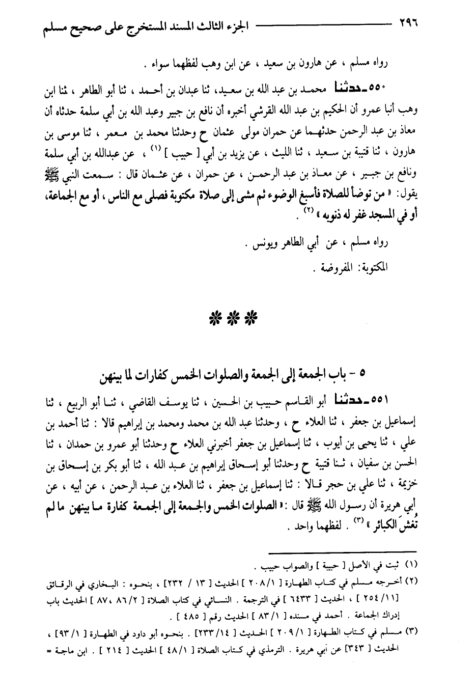 550 - حَدَّثَنَا مُحَمَّدُ بْنُ عَبْدِ اللَّهِ بْنِ سَعِيدٍ ثَنَا عَبْدَانُ بْنُ أَحْمَدَ ثَنَا أَبُو الطَّاهِرِ ثَنَا ابْنُ وَهْبٍ أَنْبَا عَمْرٌو أَنَّ الْحُكَيْمَ بْنَ عَبْدِ اللَّهِ الْقُرَشِيَّ أَخْبَرَهُ أَنَّ نَافِعَ بْنَ جُبَيْرٍ وَعَبْدَ اللَّهِ بْنَ أَبِي سَلَمَةَ حَدَّثَاهُ أَنَّ مُعَاذَ بْنَ عَبْدِ الرَّحْمَنِ حَدَّثَهُمَا عَنْ حُمْرَانَ مَوْلَى عُثْمَانَ ح وَحَدَّثَنَا مُحَمَّدُ بْنُ مَعْمَرٍ ثَنَا مُوسَى بُنْ هَارُونَ ثَنَا قُتَيْبَةُ بْنُ سَعِيدٍ ثَنَا اللَّيْثُ عَنْ يَزِيدَ بْنِ أَبِي حَبِيبٍ عَنْ عَبْدِ اللَّهِ بْنِ أَبِي سَلَمَةَ وَنَافِعِ بْنِ جُبَيْرٍ عَنْ مُعَاذِ بْنِ عَبْدِ الرَّحْمَنِ عَنْ حُمْرَانَ عَنْ عُثْمَانَ قَالَ سَمِعْتُ النَّبِيَّ صَلَّى اللَّهُ عَلَيْهِ وَسَلَّمَ يَقُولُ (مَنْ تَوَضَّأَ لِلصَّلاةِ فَأَسْبَغَ الْوُضُوءَ ثُمَّ مَشَى إِلَى صَلاةٍ مَكْتُوبَةٍ فَصَلَّى مَعَ النَّاسِ أَوْ مَعَ الْجَمَاعَةِ أَوْ فِي الْمَسْجِدِ غُفِرَ لَهُ ذُنُوبُهُ)