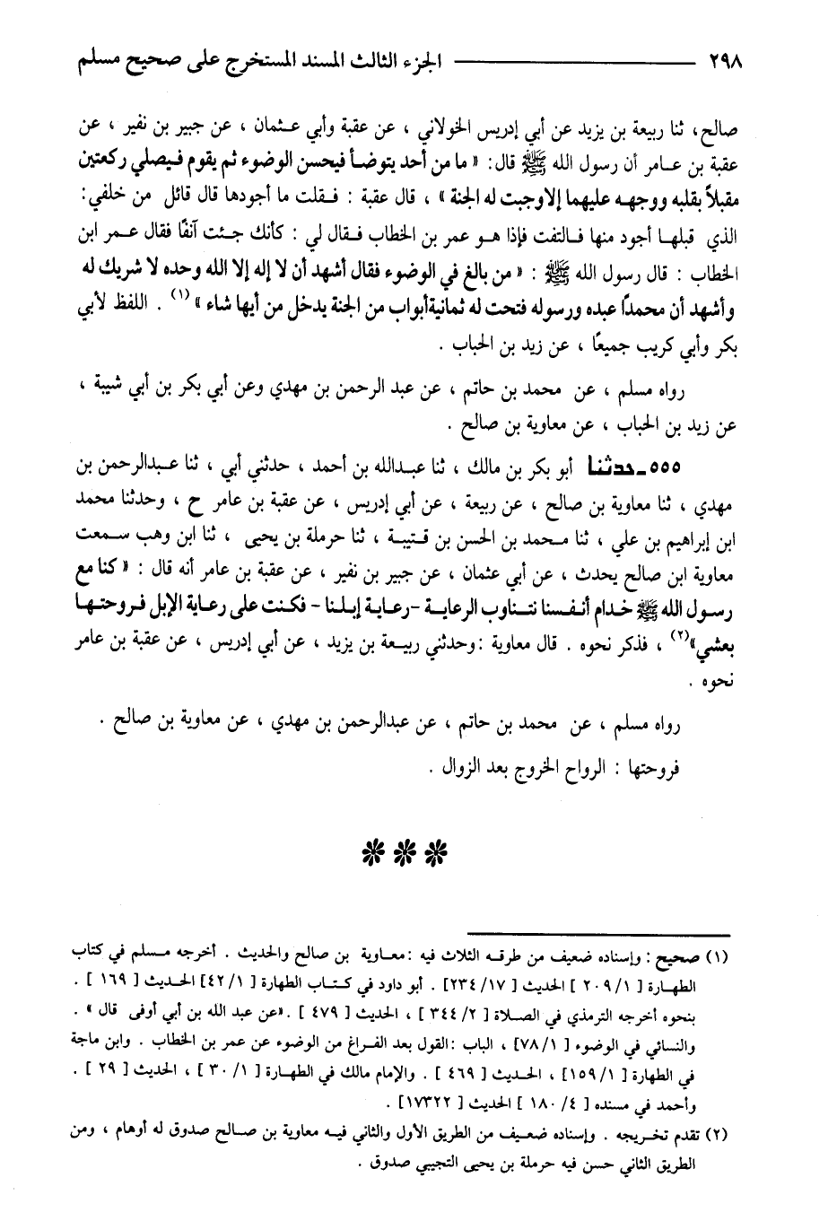رَوَاهُ مُسْلِمٌ عَنْ مُحَمَّدِ بْنِ حَاتِمٍ عَنْ عَبْدِ الرَّحْمَنِ بْنِ مَهْدِيٍّ وَعَنْ أَبِي بَكْرِ بْنِ أَبِي شَيْبَةَ عَنْ زَيْدِ بْنِ الْحُبَابِ عَنْ مُعَاوِيَةَ بْنِ صَالِحٍ