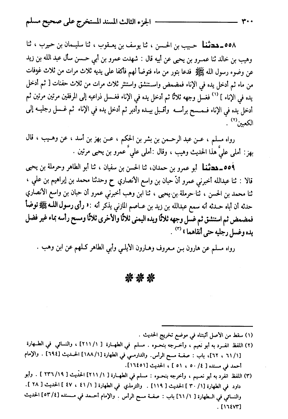 559 - حَدَّثَنَا أَبُو عَمْرِو بْنُ حَمْدَانَ ثَنَا الْحَسَنُ بْنُ سُفْيَانَ ثَنَا أَبُو الطَّاهِرِ وَحَرْمَلَةُ بْنُ يَحْيَى قَالا ثَنَا عَبْدُ اللَّهِ أَخْبَرَنِي عَمْرٌو أَنَّ حِبَّانَ بْنَ وَاسِعٍ الأَنْصَارِيَّ ح وَحَدَّثَنَا مُحَمَّدُ بْنُ إِبْرَاهِيمَ بْنِ عَلِيٍّ ثَنَا مُحَمَّدُ بْنُ الْحَسَنِ ثَنَا حَرْمَلَةُ بْنُ يَحْيَى ثَنَا ابْنُ وَهْبٍ أَخْبَرَنِي عَمْرٌو أَنَّ حِبَّانَ بْنَ وَاسِعٍ الأَنْصَارِيَّ حَدَّثَهُ أَنَّ أَبَاهُ حَدَّثَهُ أَنَّهُ سَمِعَ عَبْدَ اللَّهِ بْنَ زَيْدِ بْنِ عَاصِمٍ الْمَازِنِيَّ يَذْكُرُ أَنَّهُ (رَأَى رَسُولُ اللَّهِ صَلَّى اللَّهُ عَلَيْهِ وَسَلَّمَ تَوَضَّأَ فَمَضْمَضَ ثُمَّ اسْتَنْشَقَ ثُمَّ غَسَلَ وَجْهَهُ ثَلاثًا وَيَدَهُ الْيُمْنَى ثَلاثًا وَالْأُخْرَى ثَلاثًا وَمَسَحَ رَأْسَهُ بِمَاءٍ غَيْرِ فَضْلِ يَدِهِ وَغَسَلَ رِجْلَيْهِ حَتَّى أَنْقَاهُمَا)
