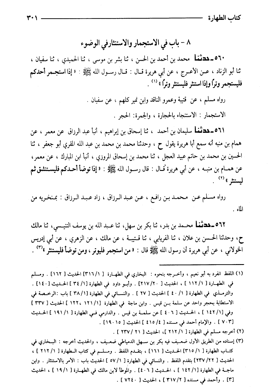 560 - حَدَّثَنَا مُحَمَّدُ بْنُ أَحْمَدَ بْنِ الْحَسَنِ ثَنَا بِشْرُ بْنُ مُوسَى ثَنَا الْحُمَيْدِيُّ ثَنَا سُفْيَانُ ثَنَا أَبُو الزِّنَادِ عَنِ الأَعْرَجِ عَنْ أَبِي هُرَيْرَةَ قَالَ قَالَ رَسُولُ اللَّهِ صَلَّى اللَّهُ عَلَيْهِ وَسَلَّمَ (إِذَا اسْتَجْمَرَ أَحَدُكُمْ فَلْيَسْتَجْمِرْ وِتْرًا وَإِذَا اسْتَنْثَرَ فَلْيَسْتَنْثِرْ وِتْرًا)