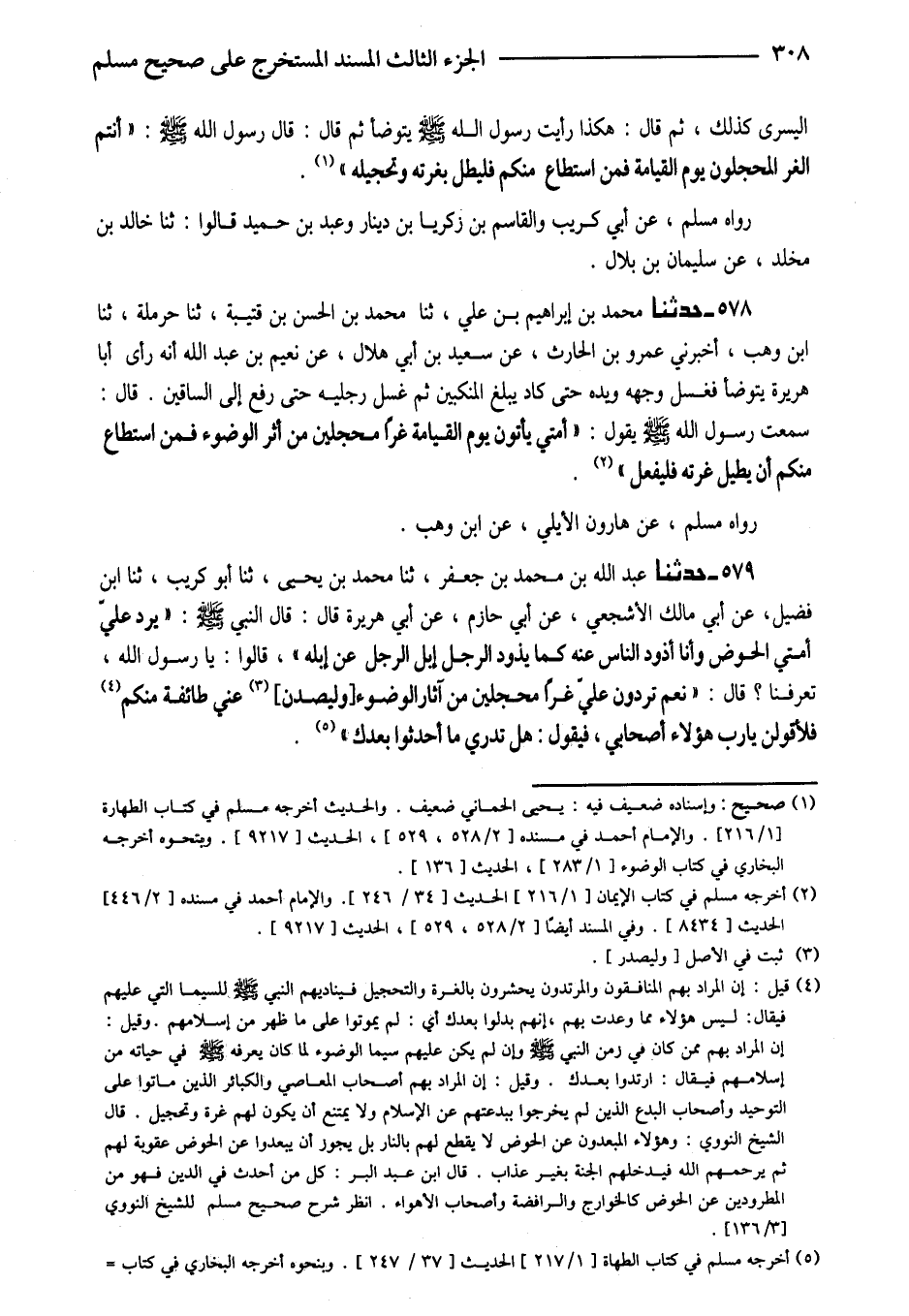 رَوَاهُ مُسْلِمٌ عَنْ أَبِي كُرَيْبٍ وَالْقَاسِمِ بْنِ زَكَرِيَّا بْنِ دِينَارٍ وَعَبْدِ بْنِ حُمَيْدٍ قَالُوا ثَنَا خَالِدُ بْنُ مَخْلَدٍ عَنْ سُلَيْمَانَ بْنِ بِلالٍ 578 حَدَّثَنَا مُحَمَّدُ بْنُ إِبْرَاهِيمَ بْنِ عَلِيٍّ ثَنَا مُحَمَّدُ بْنُ الْحَسَنِ بْنِ قُتَيْبَةَ ثَنَا حَرْمَلَةُ ثَنَا ابْنُ وَهْبٍ أَخْبَرَنِي عَمْرُو بْنُ الْحَارِثِ عَنْ سَعِيدِ بْنِ أَبِي هِلالٍ عَنْ نُعَيْمِ بْنِ عَبْدِ اللَّهِ أَنَّهُ رَأَى أَبَا هُرَيْرَةَ يَتَوَضَّأُ فَغَسَلَ وَجْهَهُ وَيَدَهُ حَتَّى كَادَ يَبْلُغُ الْمَنْكِبَيْنِ ثُمَّ غَسَلَ رِجْلَيْهِ حَتَّى رَفَعَ إِلَى السَّاقَيْنِ قَالَ سَمِعْتُ رَسُولَ اللَّهِ صَلَّى اللَّهُ عَلَيْهِ وَسَلَّمَ يَقُولُ (أُمَّتِي يَأْتُونَ يَوْمَ الْقِيَامَةِ غُرًّا مُحَجَّلِينَ مِنْ أَثَرِ الْوُضُوءِ فَمَنِ اسْتَطَاعَ مِنْكُمْ أَنْ يُطِيلَ غُرَّتَهُ فَلْيَفْعَلْ)