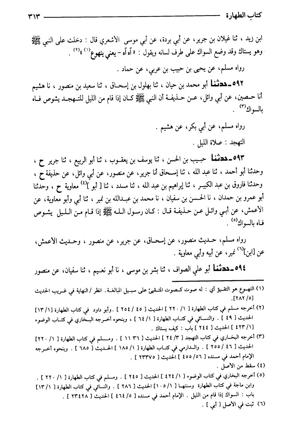 592 - حَدَّثَنَا أَبُو مُحَمَّدِ بْنُ حَيَّانَ ثَنَا بُهْلُولُ بْنُ إِسْحَاقَ ثَنَا سَعِيدُ بْنُ مَنْصُورٍ نَا هُشَيْمٌ أَنَا حُصَيْنٌ عَنْ أَبِي وَائِلٍ عَنْ حُذَيْفَةَ إِنَّ النَّبِيَّ صَلَّى اللَّهُ عَلَيْهِ وَسَلَّمَ كَانَ إِذَا قَامَ مِنَ اللَّيْلِ لِلتَّهَجُّدِ يَشُوصُ فَاهُ بِالسِّوَاكِ