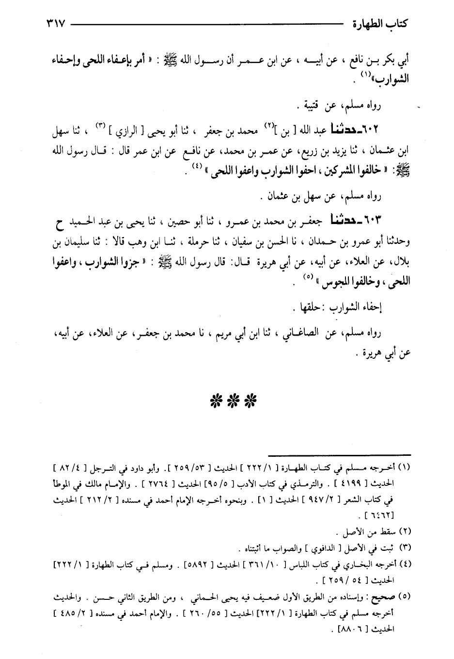 603 - حَدَّثَنَا جَعْفَرُ بْنُ مُحَمَّدِ بْنِ عَمْرٍو ثَنَا أَبُو حُصَيْنٍ ثَنَا يَحْيَى بْنُ عَبْدِ الْحَمِيدِ ح وَحَدَّثَنَا أَبُو عَمْرِو بْنُ حَمْدَانَ نَا الْحَسَنُ بْنُ سُفْيَانَ ثَنَا حَرْمَلَةُ ثَنَا بن وَهْبٍ قَالا ثَنَا سُلَيْمَانُ بْنُ بِلالٍ عَنِ الْعَلاءِ عَنْ أَبِيهِ عَنْ أَبِي هُرَيْرَةَ قَالَ قَالَ رَسُولُ اللَّهِ صَلَّى اللَّهُ عَلَيْهِ وَسَلَّمَ (جُزُّوا الشَّوَارِبَ وَأَعْفُوا اللِّحَى وخالفوا الْمَجُوس) صَحِيح وَإِسْنَاده من الطَّرِيق الأول ضَعِيف