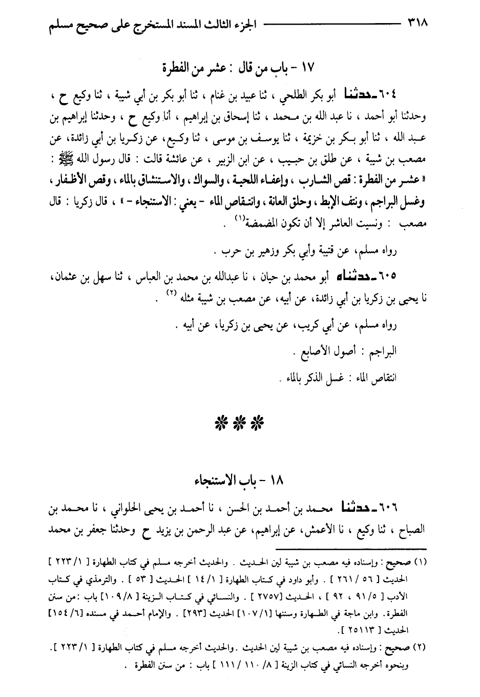 604 - حَدَّثَنَا أَبُو بَكْرٍ الطَّلْحِيُّ ثَنَا عُبَيْدُ بْنُ غَنَّامٍ ثَنَا أَبُو بَكْرِ بْنُ أَبِي شَيْبَةَ ثَنَا وَكِيعٌ ح وَحَدَّثَنَا أَبُو أَحْمَدَ نَا عَبْدُ اللَّهِ بْنُ مُحَمَّدٍ ثَنَا إِسْحَاقُ بْنُ إِبْرَاهِيمَ أَنَا وَكِيعٌ ح وَحَدَّثَنَا إِبْرَاهِيمُ بْنُ عَبْدِ اللَّهِ ثَنَا أَبُو بَكْرِ بْنُ خُزَيْمَةَ ثَنَا يُوسُفُ بْنُ مُوسَى ثَنَا وَكِيعٌ عَنْ زَكَرِيَّا بْنِ أَبِي زَائِدَةَ عَنْ مُصْعَبِ بْنِ شَيْبَةَ عَنْ طَلْقِ بْنِ حَبِيبٍ عَنِ ابْنِ الزُّبَيْرِ عَنْ عَائِشَةَ قَالَتْ قَالَ رَسُولُ اللَّهِ صَلَّى اللَّهُ عَلَيْهِ وَسَلَّمَ (عَشْرٌ مِنَ الْفِطْرَةِ قَصُّ الشَّارِبِ وَإِعْفَاءُ اللِّحْيَةِ وَالسِّوَاكُ وَالاسْتِنْشَاقُ بِالْمَاءِ وَقَصُّ الأَظْفَارِ وَغَسْلُ الْبَرَاجِمِ وَنَتْفُ الإِبْطِ وَحَلْقُ الْعَانَةِ وَانْتِقَاصُ الْمَاءِ يَعْنِي الاسْتِنْجَاءَ) قَالَ زَكَرِيَّا قَالَ مُصْعَبٌ وَنَسِيتُ الْعَاشِرَ إِلا أَنْ تكون الْمَضْمَضَة صَحِيح وَإِسْنَاده فِيهِ مُصعب بن شيبَة لين الْحَدِيثَ