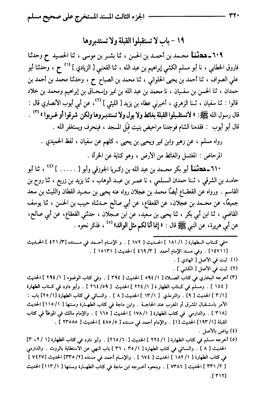 609 - حَدَّثَنَا مُحَمَّدُ بْنُ أَحْمَدَ بْنِ الْحَسَنِ ثَنَا بِشْرُ بْنُ مُوسَى ثَنَا الْحُمَيْدُ ح وَحَدَّثَنَا فَارُوقٌ الْخَطَّابِيُّ نَا أَبُو مُسْلِمٍ الْكَشِّيُّ إِبْرَاهِيمُ بْنُ عَبْدِ اللَّهِ ثَنَا القعْنبِي الزيَادي ح وَحَدَّثَنَا أَبُو عَلِيٍّ الصَّوَّافُ ثَنَا أَحْمَدُ بْنُ يَحْيَى الْحُلْوَانِيُّ ثَنَا مُحَمَّدُ بْنُ الصَّبَّاحِ ح وَحَدَّثَنَا مُحَمَّدُ بْنُ أَحْمَدَ بْنِ حَمْدَانَ ثَنَا الْحَسَنُ بْنُ سُفْيَانَ نَا مُحَمَّدُ بْنُ عَبْدِ اللَّهِ بْنِ نُمَيْرٍ وَإِسْحَاقُ بْنُ إِبْرَاهِيمَ وَمُحَمَّدُ بْنُ خَلادٍ قَالُوا ثَنَا سُفْيَانُ ثَنَا الزُّهْرِيُّ أَخْبَرَنِي عَطَاءُ بْنِ يَزِيدَ اللَّيْثِيِّ عَنْ أَبِي أَيُّوبَ الأَنْصَارِيِّ قَالَ قَالَ رَسُولُ اللَّهِ صَلَّى اللَّهُ عَلَيْهِ وَسَلَّمَ (لَا تَسْتَقْبِلُوا الْقِبْلَةَ بِغَائِطٍ وَلا بَوْلٍ وَلا تَسْتَدْبِرُوهَا وَلَكِنْ شَرِّقُوا أَوْ غَرِّبُوا)
