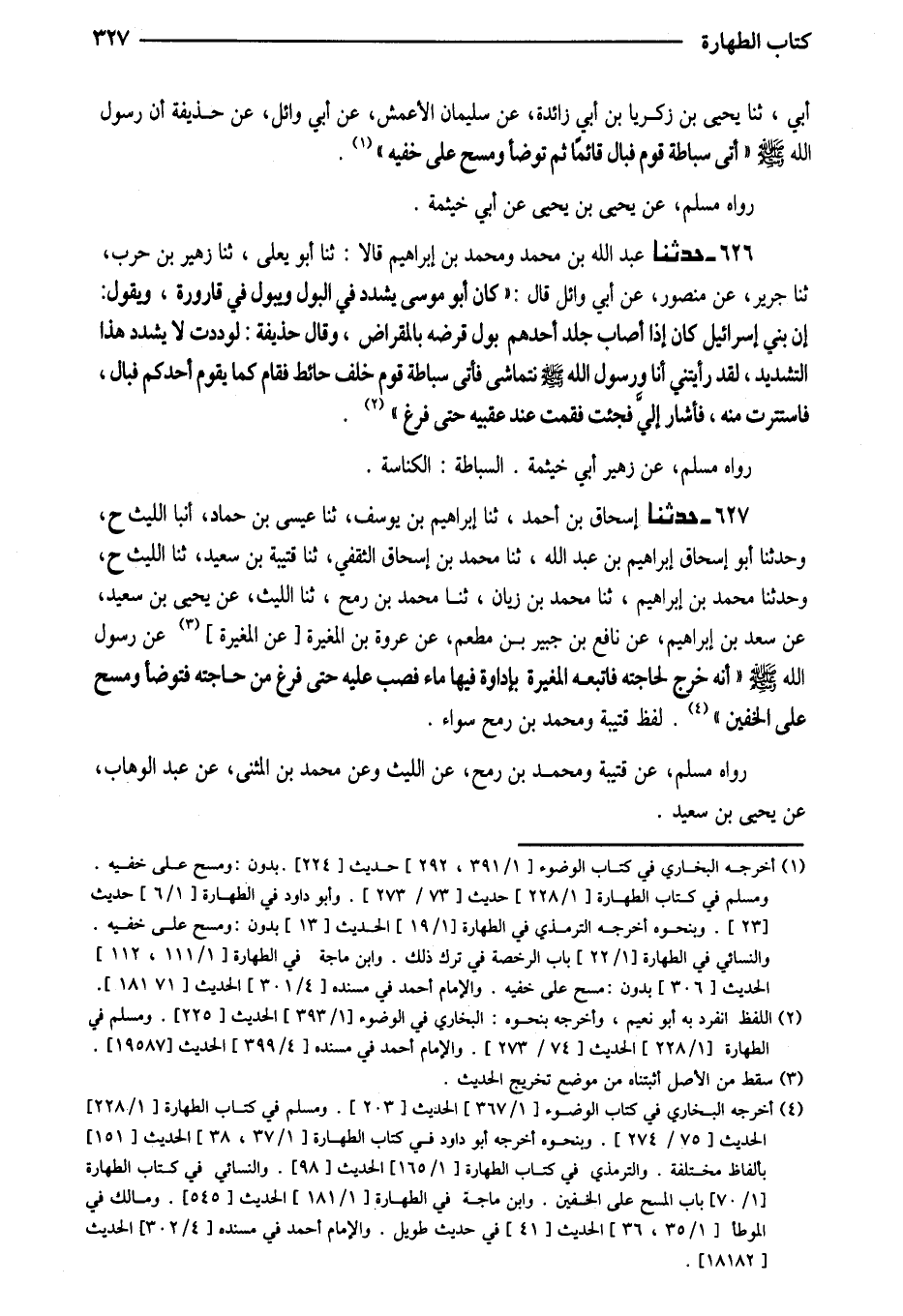 أَبِي ثَنَا يَحْيَى بْنُ زَكَرِيَّا بْنِ أَبِي زَائِدَةَ عَنْ سُلَيْمَانَ الأَعْمَشِ عَنْ أَبِي وَائِلٍ عَنْ حُذَيْفَةَ أَنَّ رَسُولَ اللَّهِ صَلَّى اللَّهُ عَلَيْهِ وَسَلَّمَ (أَتَى سُبَاطَةَ قَوْمٍ فَبَالَ قَائِمًا ثُمَّ تَوَضَّأَ وَمَسَحَ عَلَى خُفَّيْهِ)