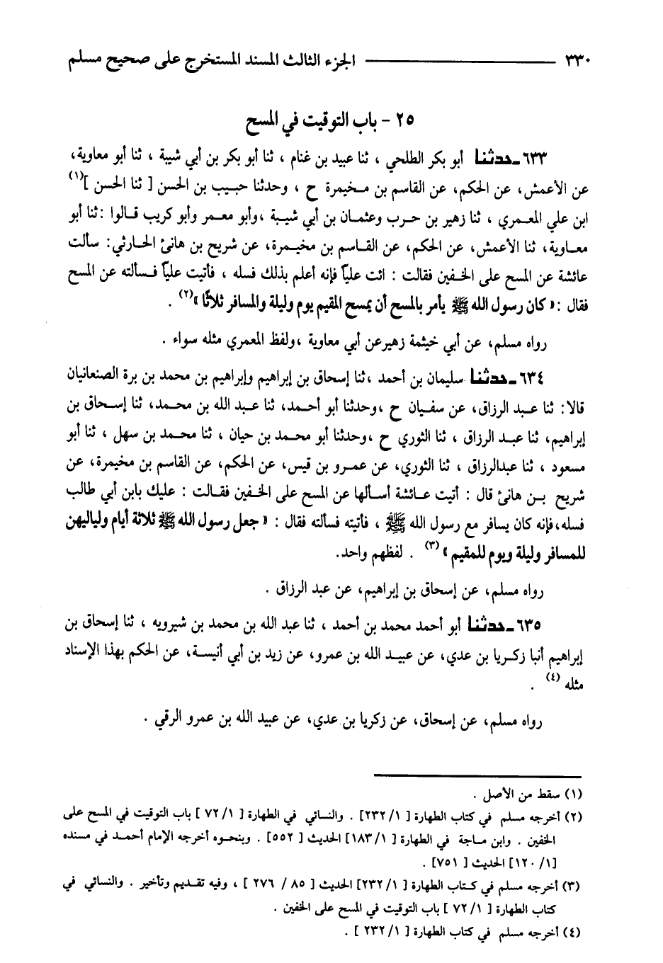 633 - حَدَّثَنَا أَبُو بَكْرٍ الطَّلْحِيُّ ثَنَا عُبَيْدُ بْنُ غَنَّامٍ ثَنَا أَبُو بَكْرِ بْنُ أَبِي شَيْبَةَ ثَنَا أَبُو مُعَاوِيَةَ عَنِ الأَعْمَشِ عَنِ الْحَكَمِ عَنِ الْقَاسِمِ بْنِ مُخَيْمِرَةَ ح وَحَدَّثَنَا حَبِيبُ بْنُ الْحَسَنِ ثَنَا الْحسن ابْن عَلِيٍّ الْمَعْمَرِيُّ ثَنَا زُهَيْرُ بْنُ حَرْبٍ وَعُثْمَانُ بْنُ أَبِي شَيْبَةَ وَأَبُو مَعْمَرٍ وَأَبُو كُرَيْبٍ قَالُوا ثَنَا أَبُو مُعَاوِيَةَ ثَنَا الأَعْمَشُ عَنِ الْحَكَمِ عَنِ الْقَاسِمِ بْنِ مخيمرة عَن شُرَيْح بن هانىء الْحَارِثِيِّ سَأَلْتُ عَائِشَةَ عَنِ الْمَسْحِ عَلَى الْخُفَّيْنِ فَقَالَتْ ائْتِ عَلِيًّا فَإِنَّهُ أَعْلَمُ بِذَلِكَ فَسَلْهُ فَأَتَيْتُ عَلِيًّا فَسَأَلْتُهُ عَنِ الْمَسْحِ فَقَالَ (كَانَ رَسُولُ اللَّهِ صَلَّى اللَّهُ عَلَيْهِ وَسَلَّمَ يَأْمُرُ بِالْمَسْحِ أَنْ يمسح الْمُقِيم يَوْم وَلَيْلَةً وَالْمُسَافِرُ ثَلاثًا)