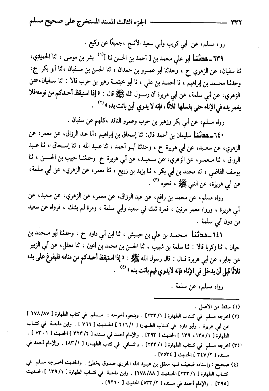 639 - حَدَّثَنَا أَبُو عَلِيٍّ مُحَمَّدُ بْنُ أَحْمَدَ بْنِ الْحَسَنِ ثَنَا بِشْرُ بْنُ مُوسَى ثَنَا الْحُمَيْدِيُّ ثَنَا سُفْيَانُ عَنْ الزُّهْرِيِّ ح وَحَدَّثَنَا أَبُو عَمْرِو بْنُ حَمْدَانَ ثَنَا الْحَسَنُ بْنُ سُفْيَانَ ثَنَا أَبُو بَكْرٍ ح وَحَدَّثَنَا مُحَمَّدُ بْنُ إِبْرَاهِيمَ نَا أَحْمَدُ بْنُ عَلِيٍّ نَا أَبُو خَيْثَمَةَ زُهَيْرُ بْنُ حَرْبٍ قَالا ثَنَا سُفْيَانُ عَنِ الزُّهْرِيِّ عَنْ أَبِي سَلَمَةَ عَنْ أَبِي هُرَيْرَةَ إِنَّ رَسُولَ اللَّهِ صَلَّى اللَّهُ عَلَيْهِ وَسَلَّمَ قَالَ (إِذَا اسْتَيْقَظَ أَحَدُكُمْ مِنْ نَوْمِهِ فَلا يَغْمُرُ يَدَهُ فِي الإِنَاءِ حَتَّى يَغْسِلَهَا ثَلاثًا فَإِنَّهُ لَا يَدْرِي أَيْنَ بَاتَتْ يَدَهُ)